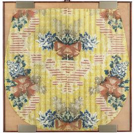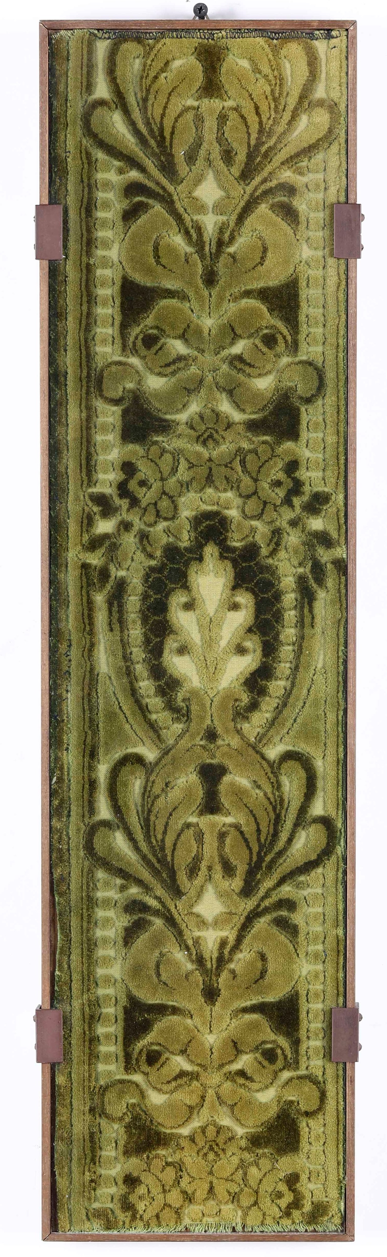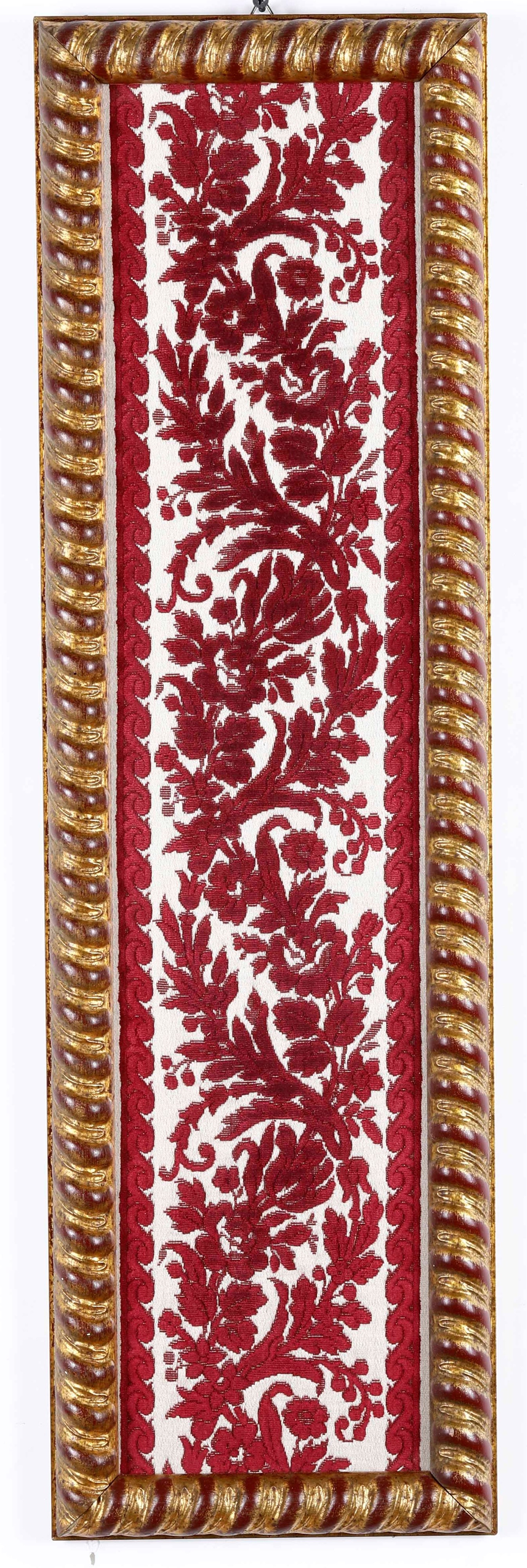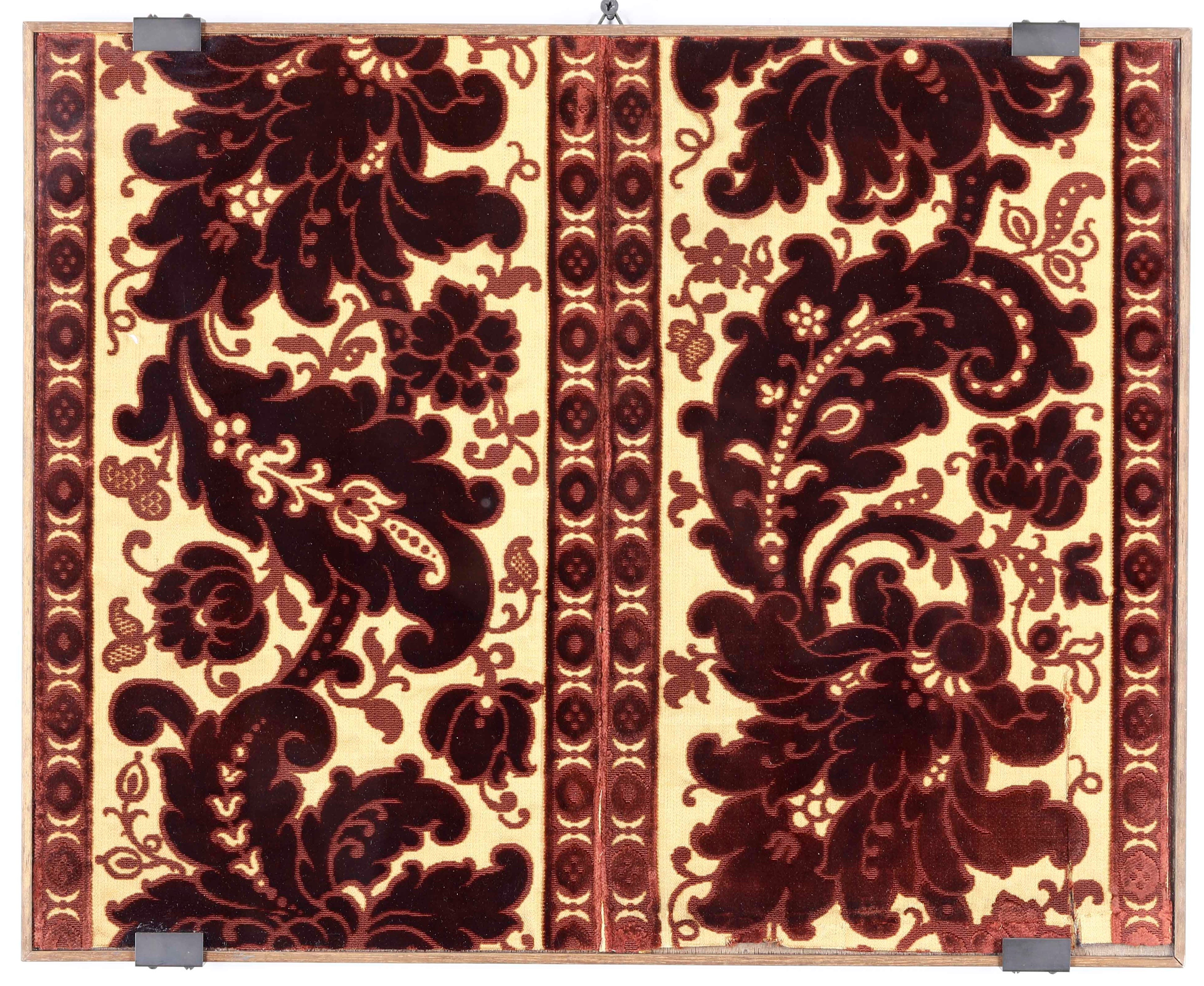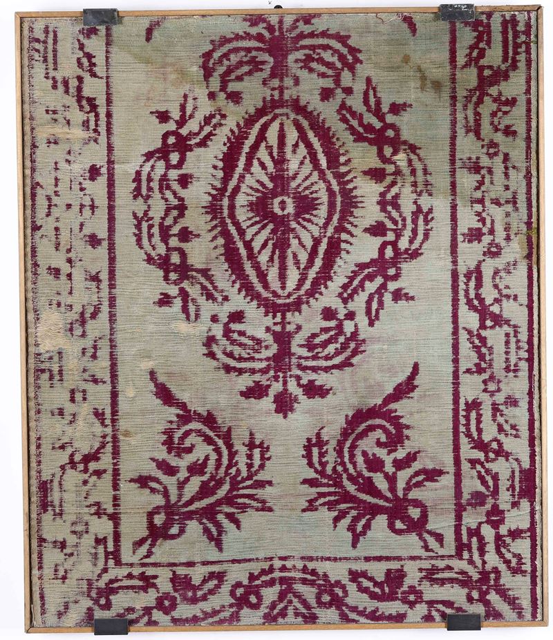 uno in seta gialla con decoro floreale cm 52x50, uno con decoro bordeaux cm 56x46, uno in seta giallo con velluto operato bordeaux cm 51x41, uno in velluto operato verde cm 68x17, uno in velluto operato rosso scuro cm 76x22