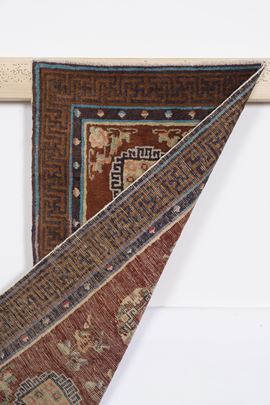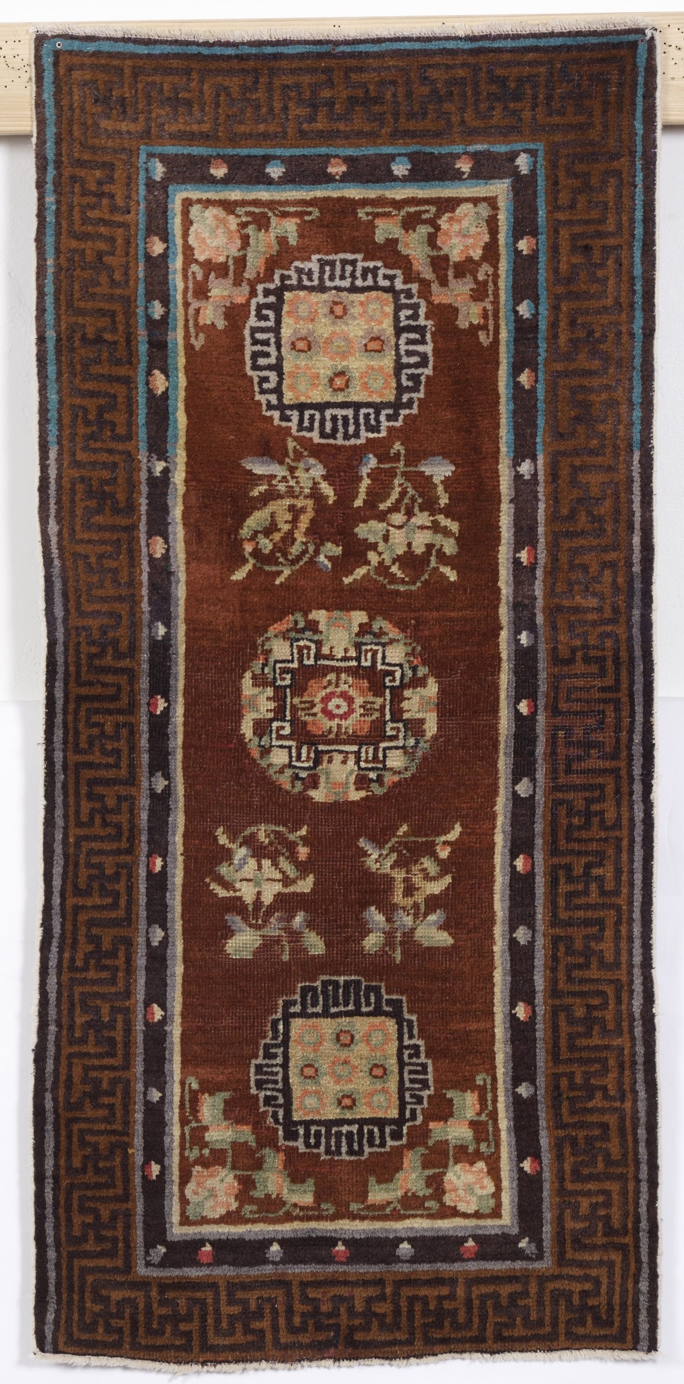 fondo tabacco con tre medaglioni, bordura principale a linea di tuono una secondaria con perle simbolo di purezza.