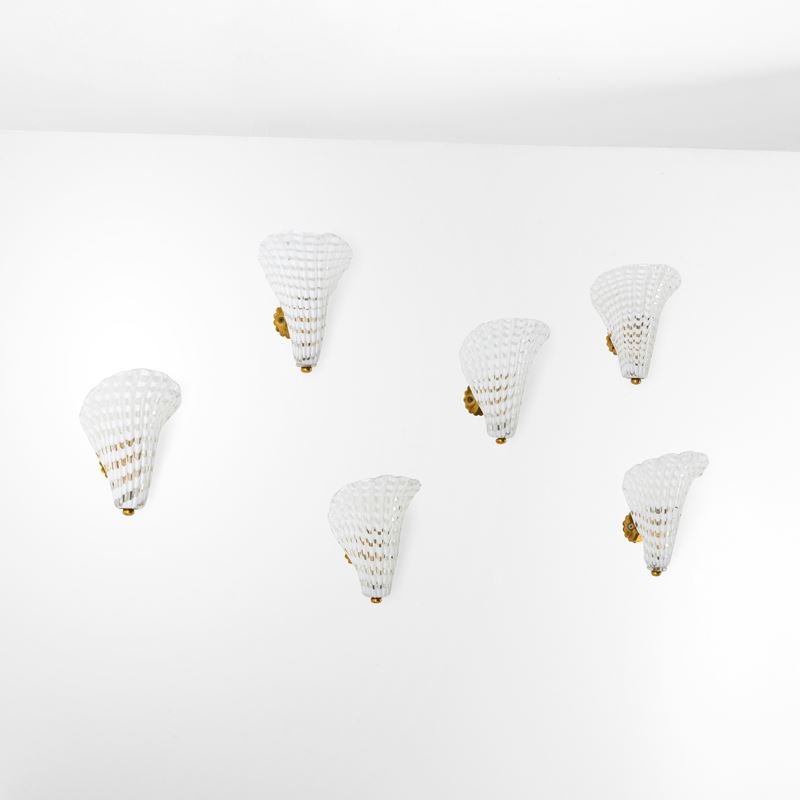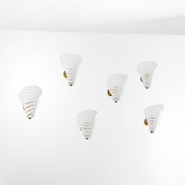 Struttura in ottone con diffusori in vetro di Murano trasparente e lattimo.