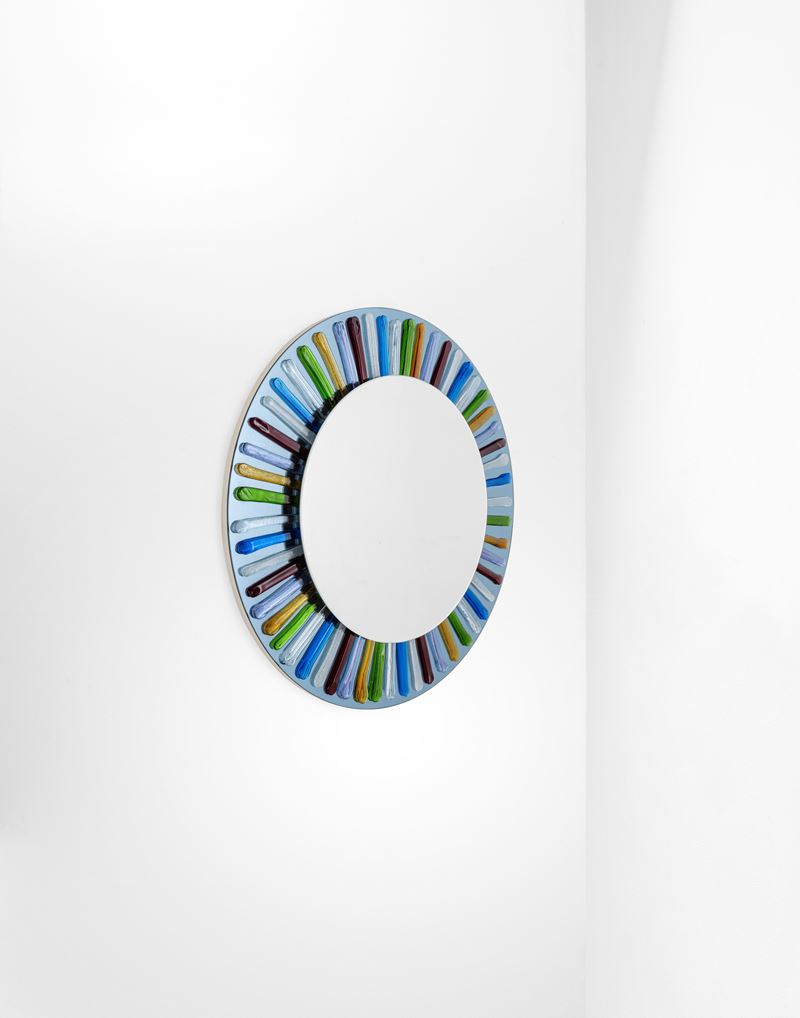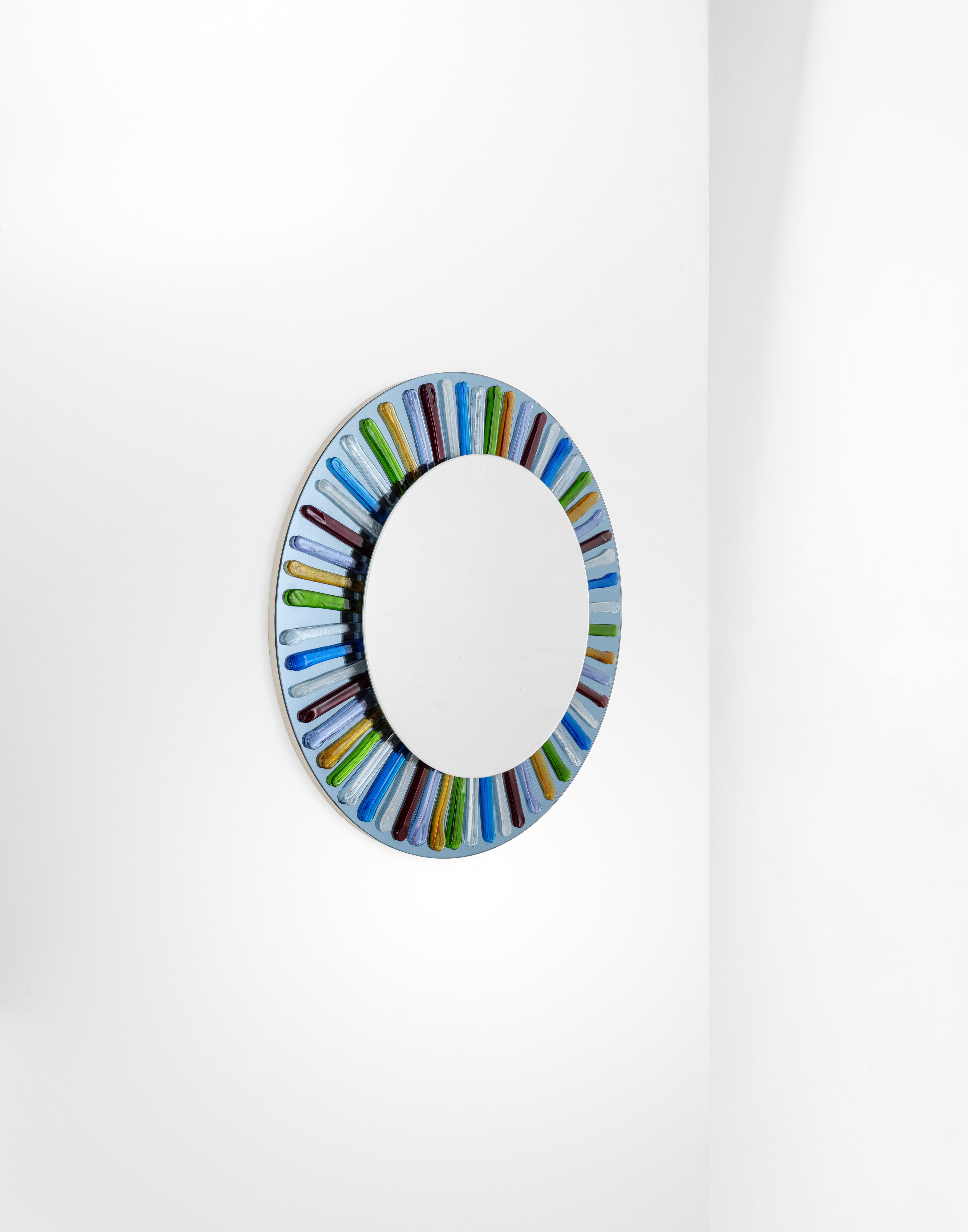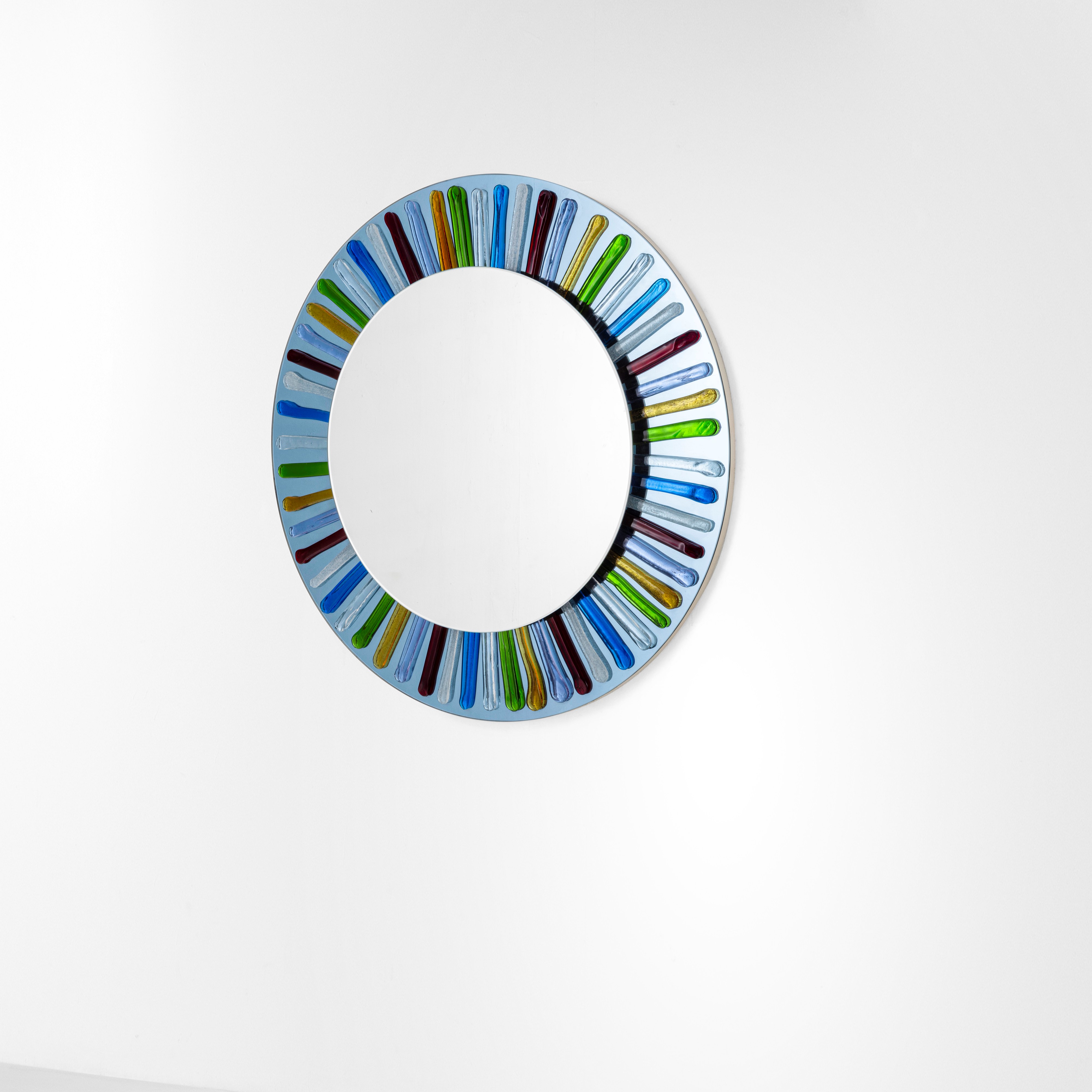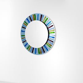 Struttura legno, cristallo specchiato e formelle in vetro di Murano colorato.