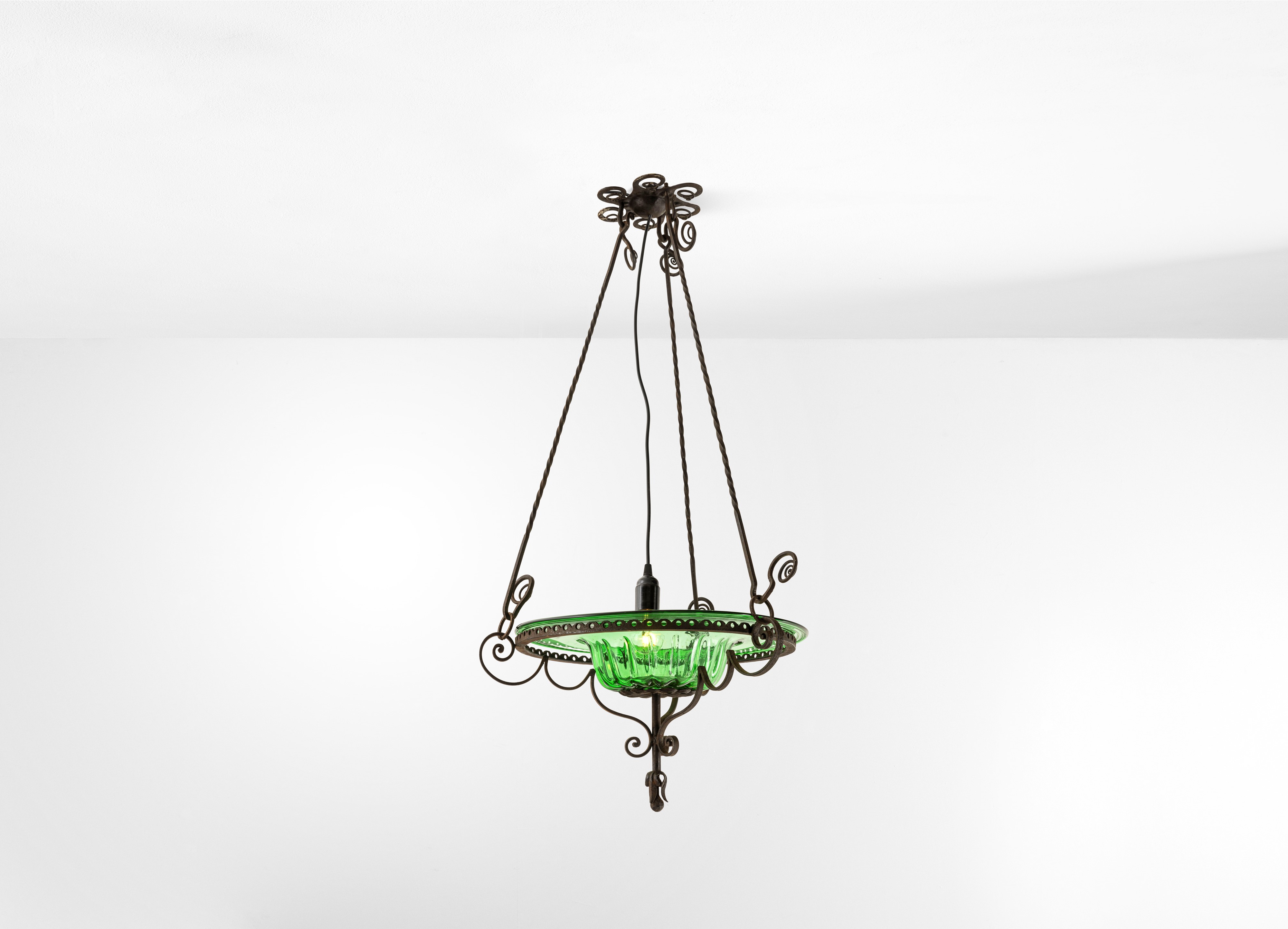 Struttura in ferro battuto con diffusore in vetro di Murano colorato.