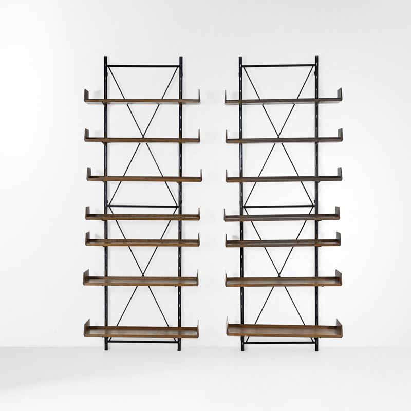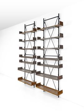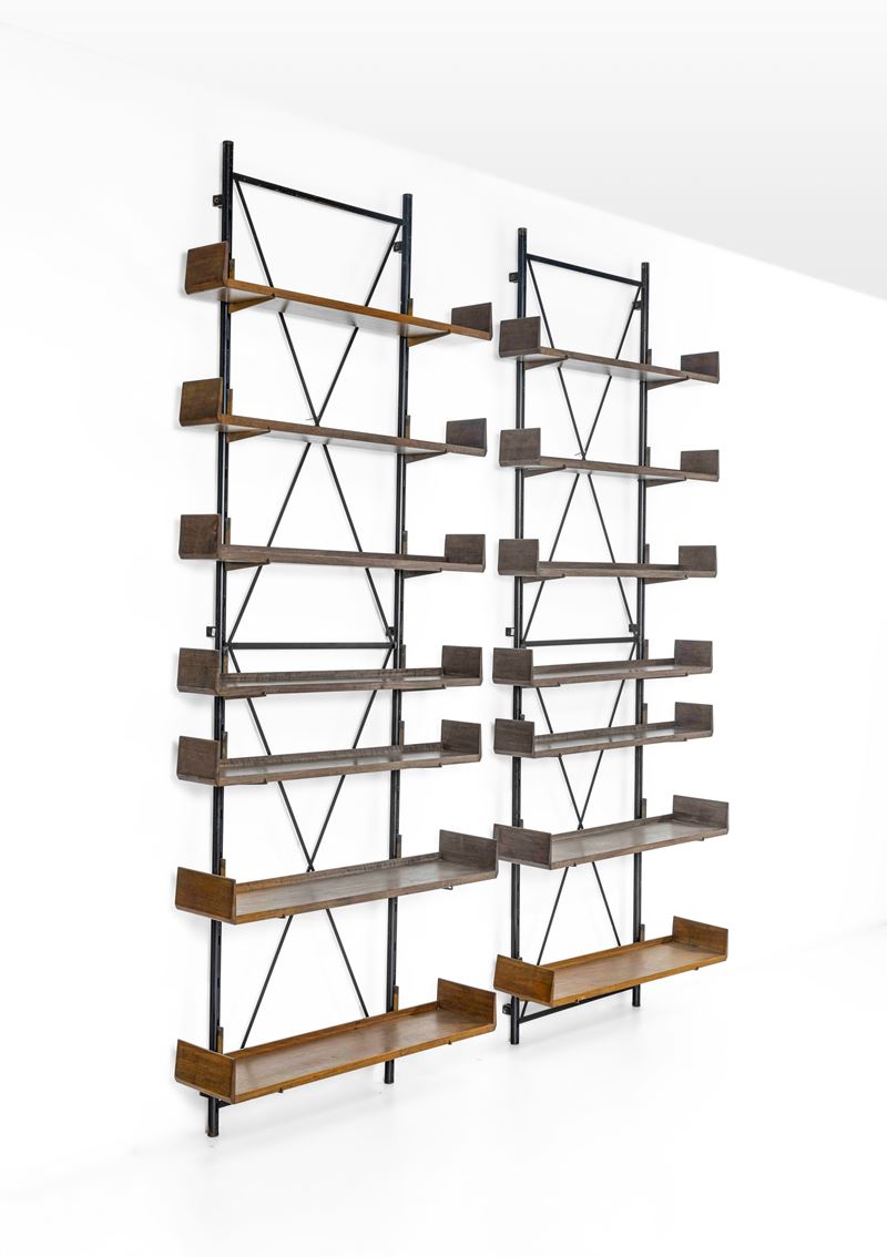 Struttura in metallo laccato con mensole in legno e dettagli in ottone.