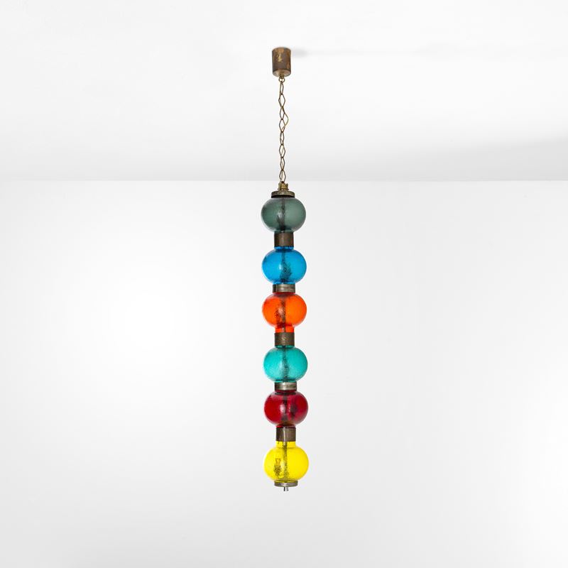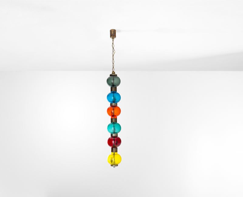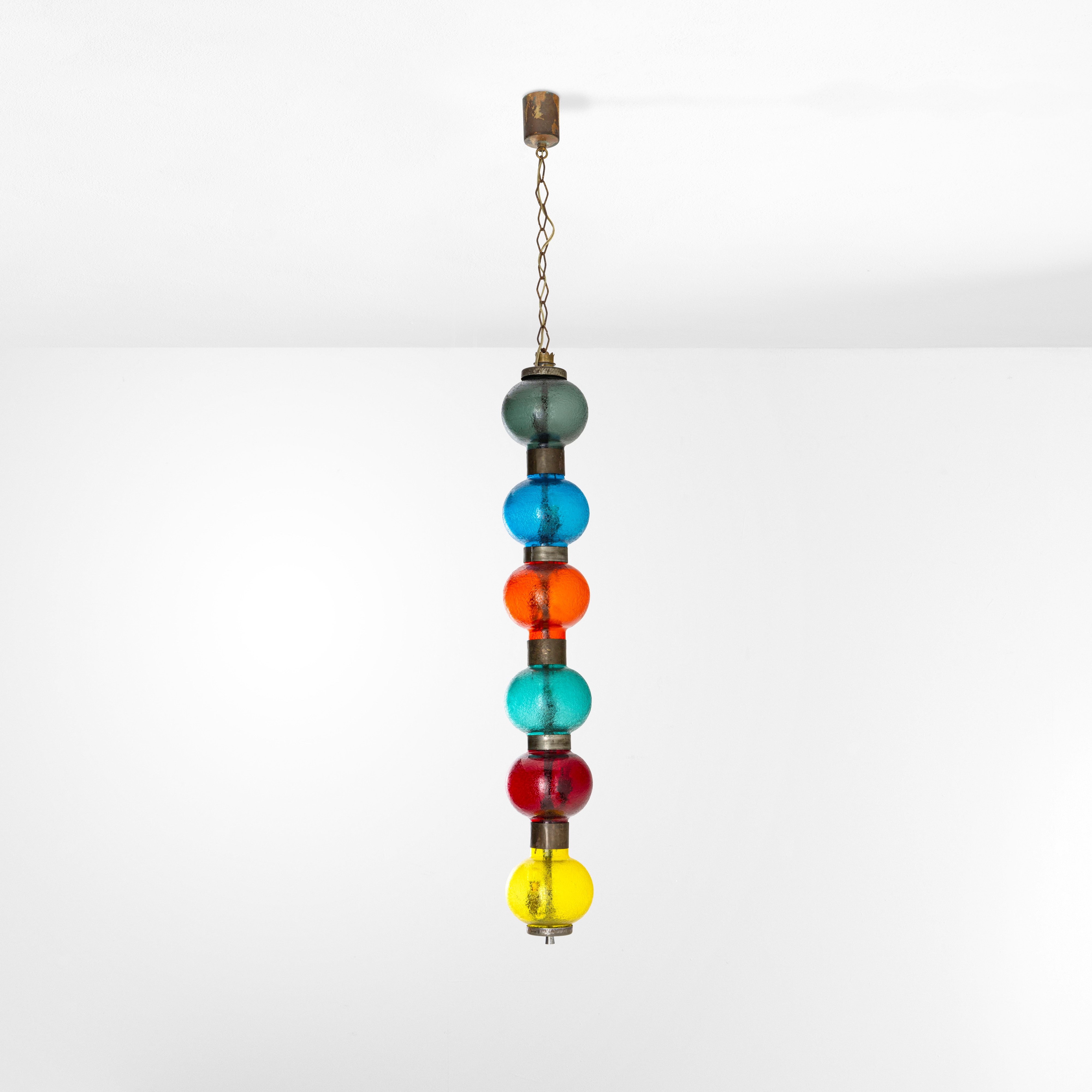 Struttura in ottone nichelato con diffusori in vetro di Murano soffiato, acidato e colorato.