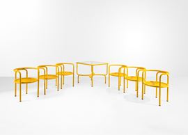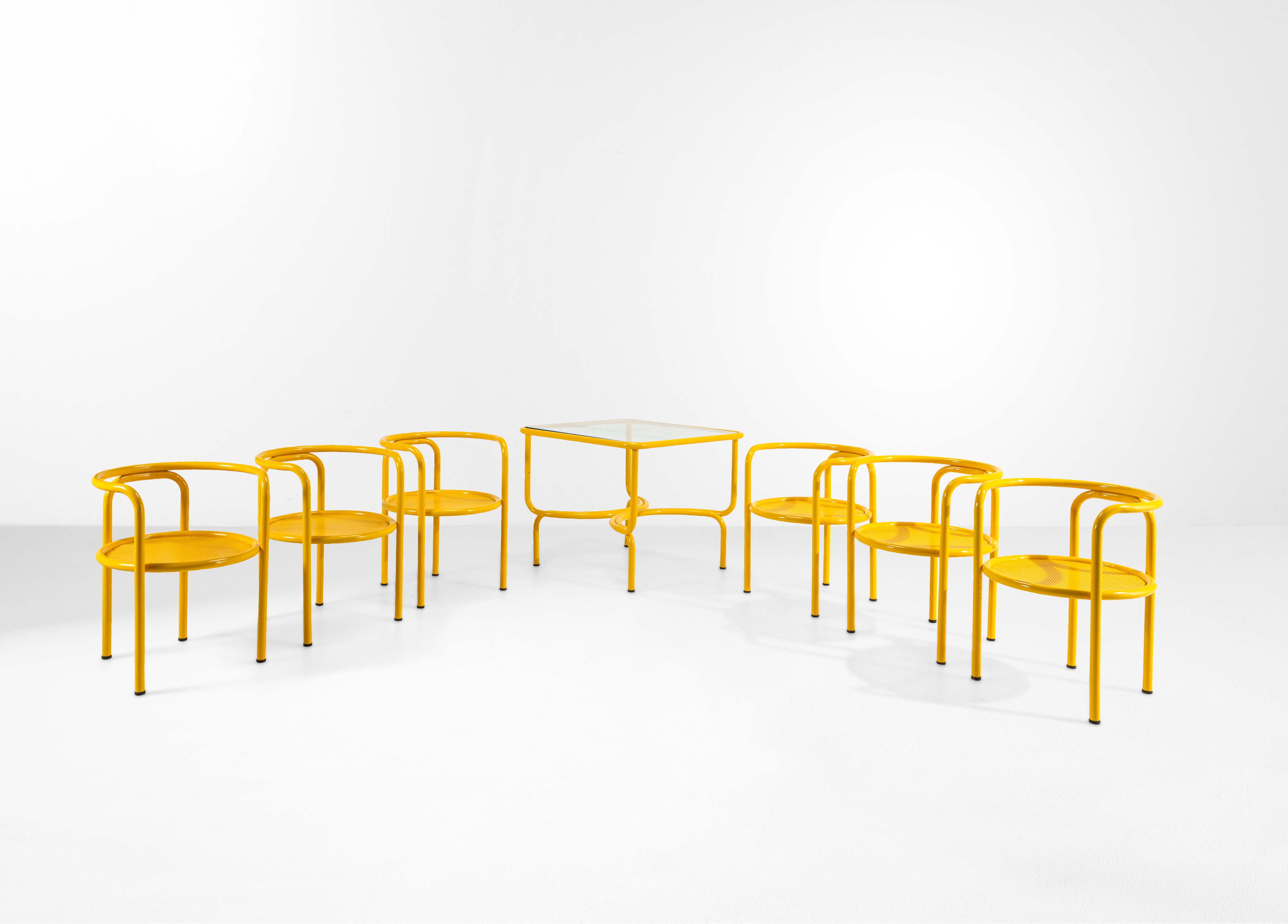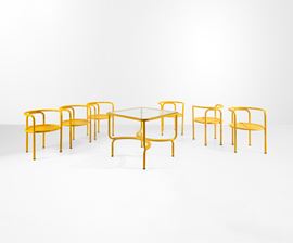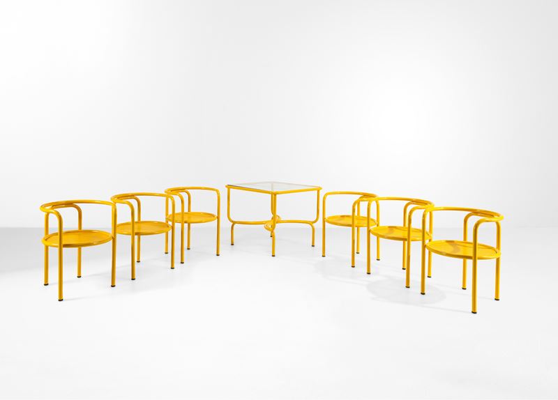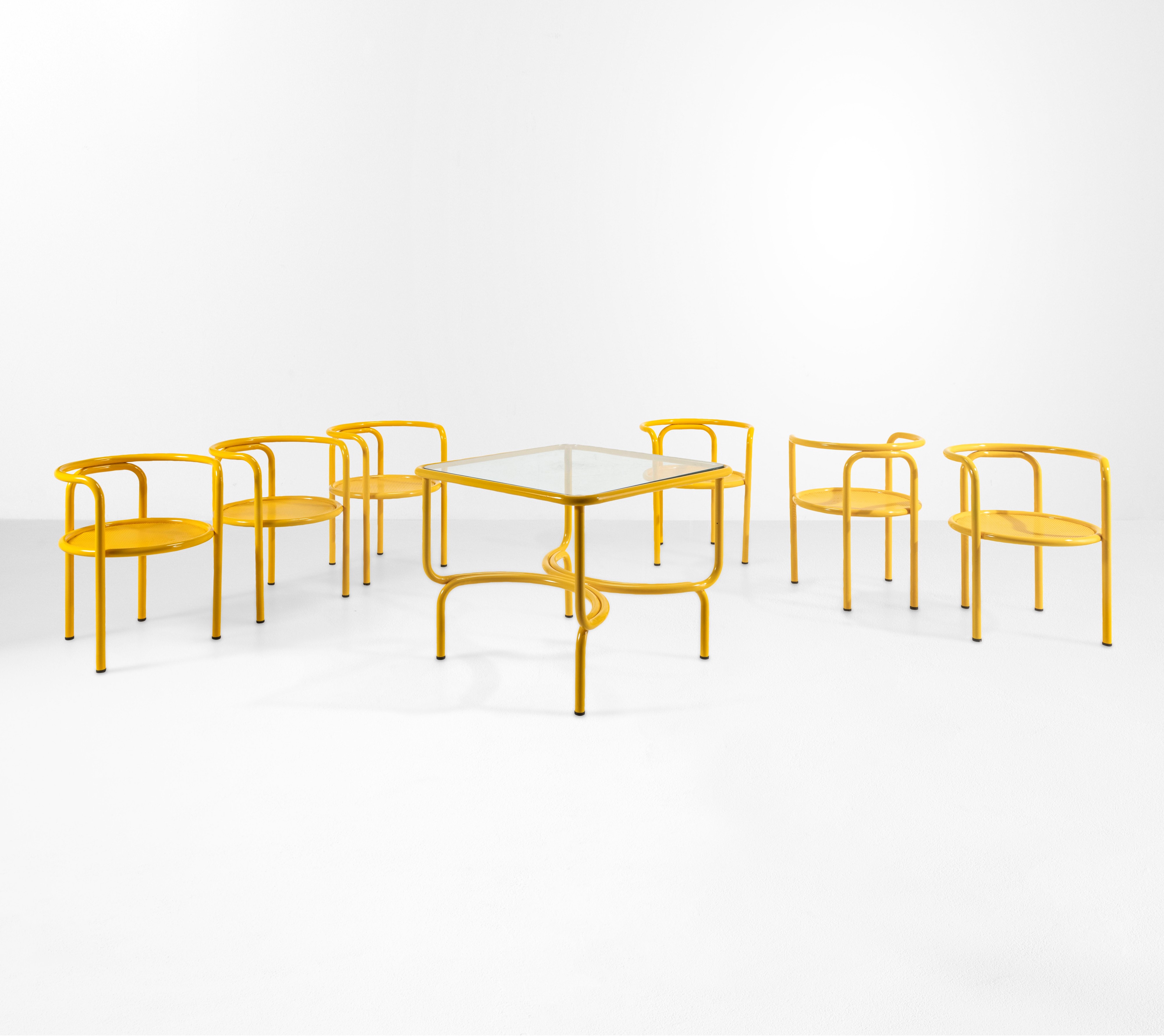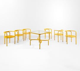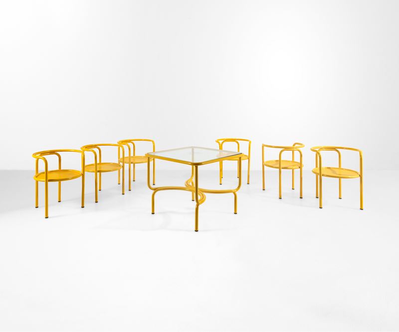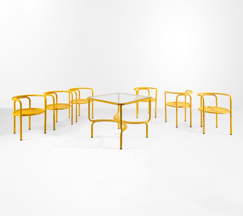 Un tavolo e sei sedie della serie Locus Solus.