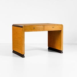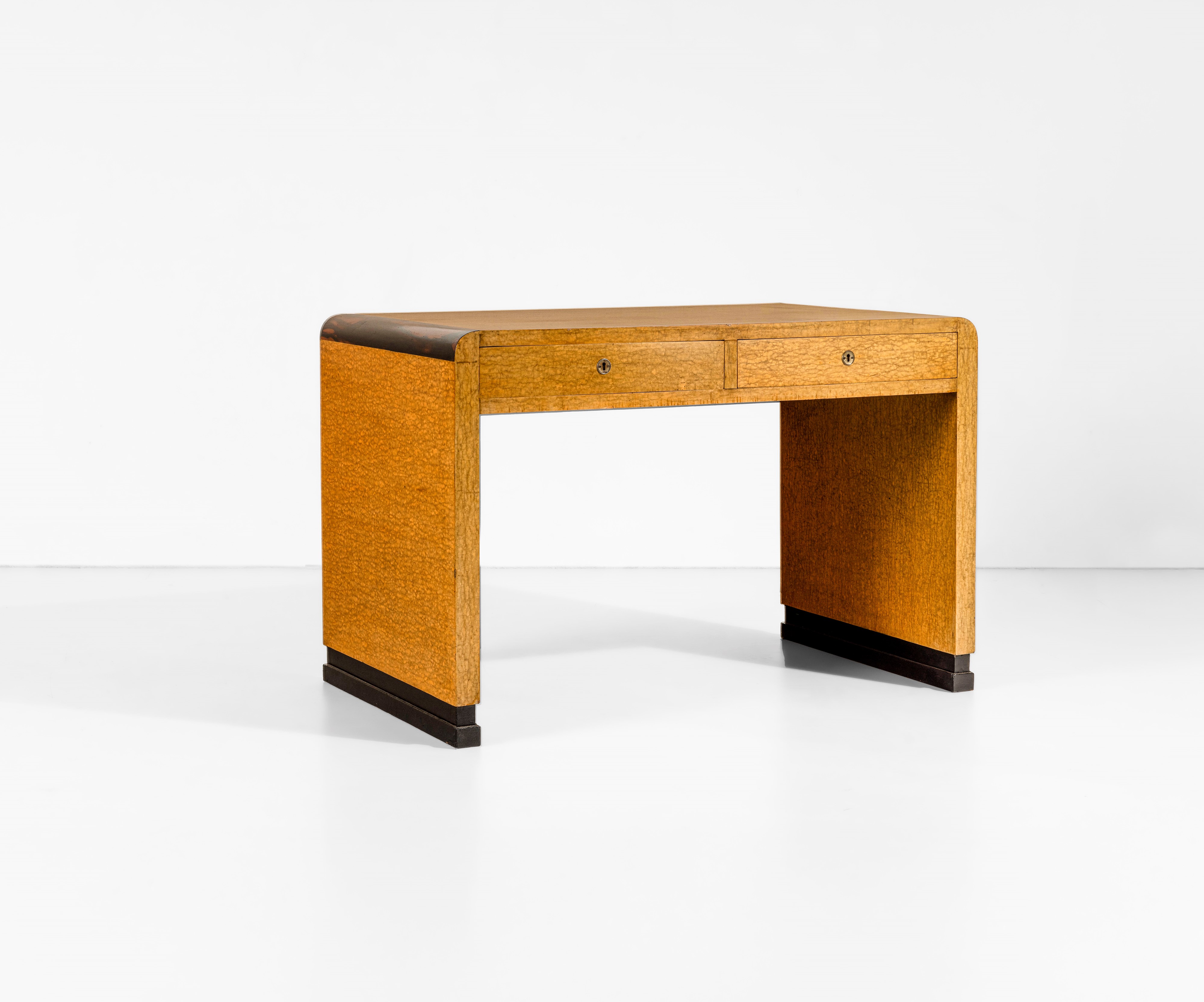 Struttura e piano in legno rivestiti in buxus e piedi in legno ebanizzato. Dettagli in metallo.