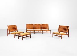 Struttura in legno e intreccio in pelle. Cuscini in tessuto.