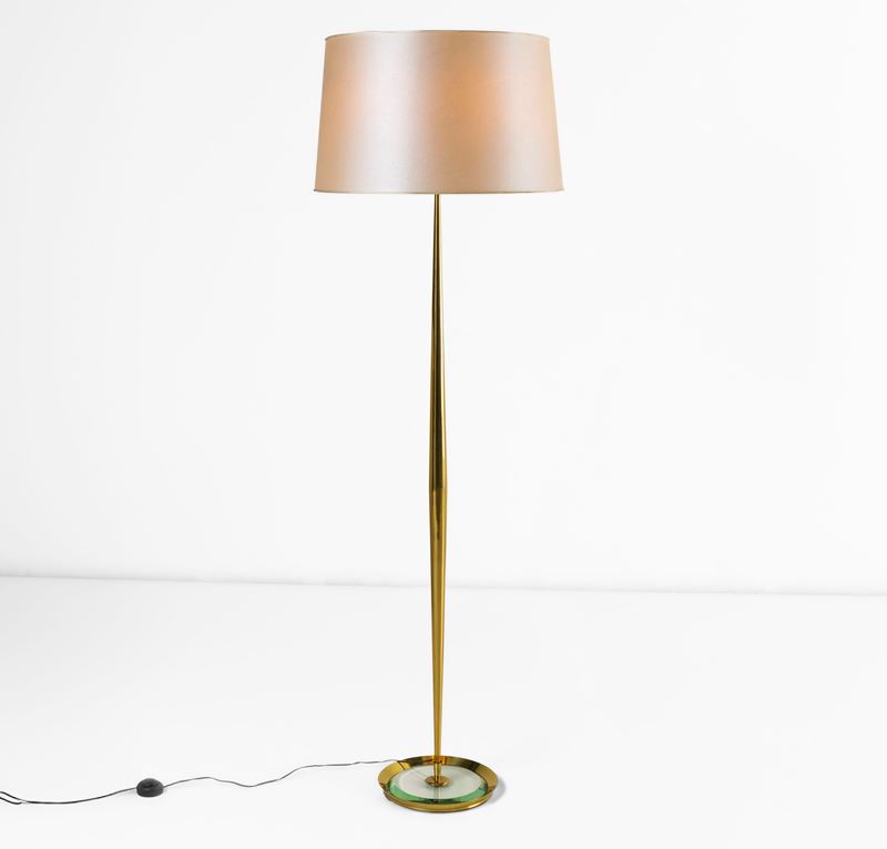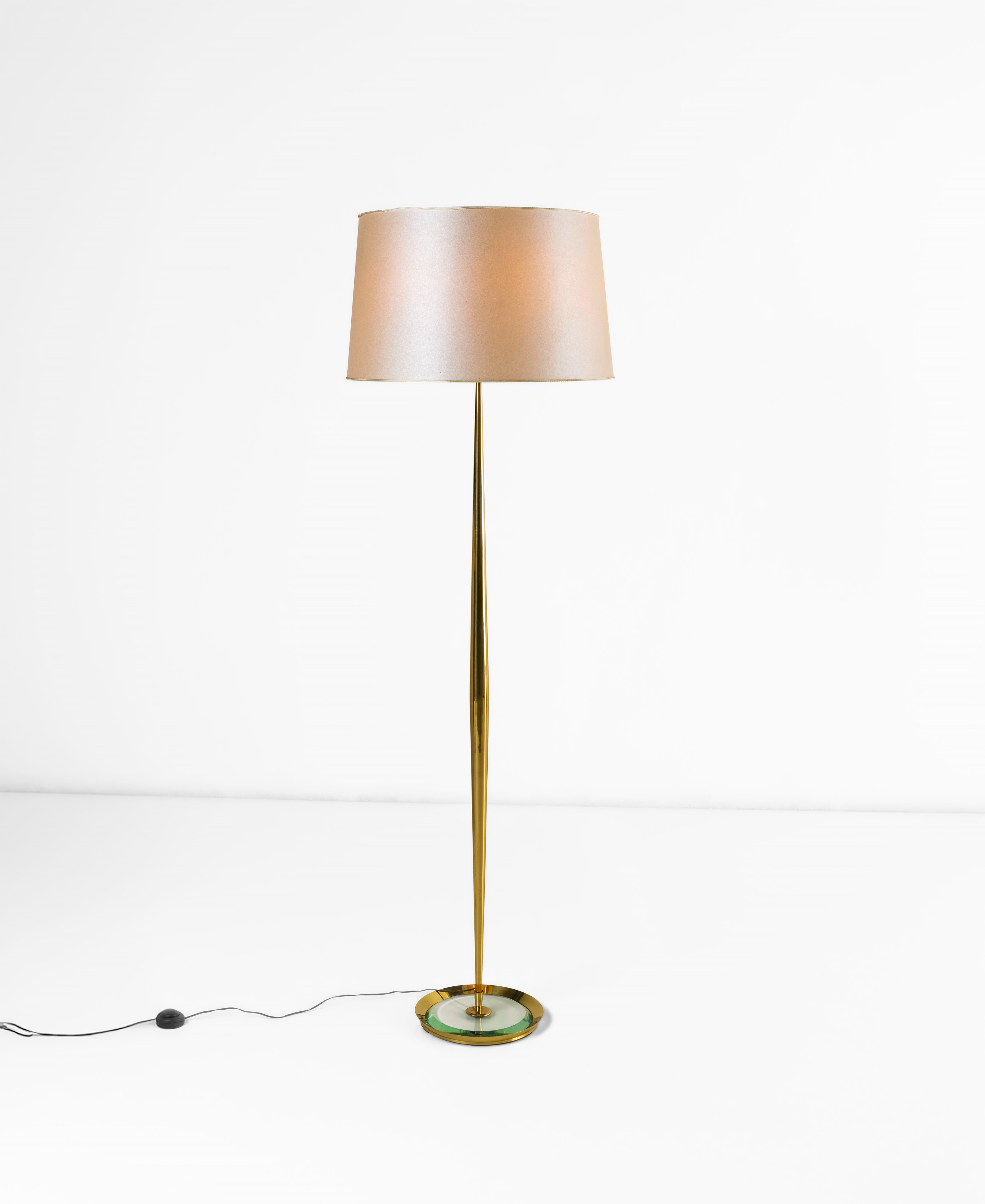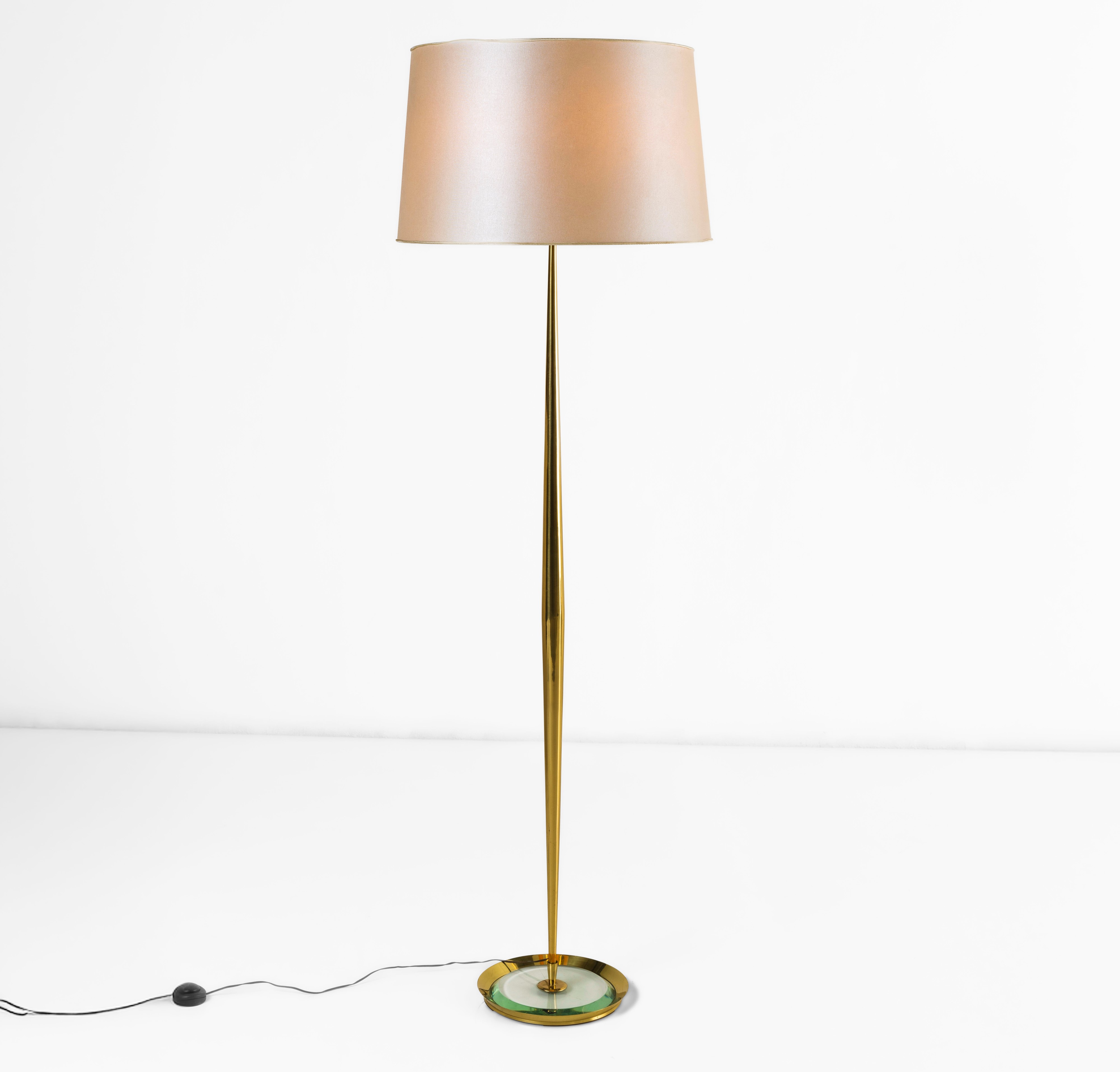 Struttura in ottone, base in cristallo molato e paralume in tessuto.