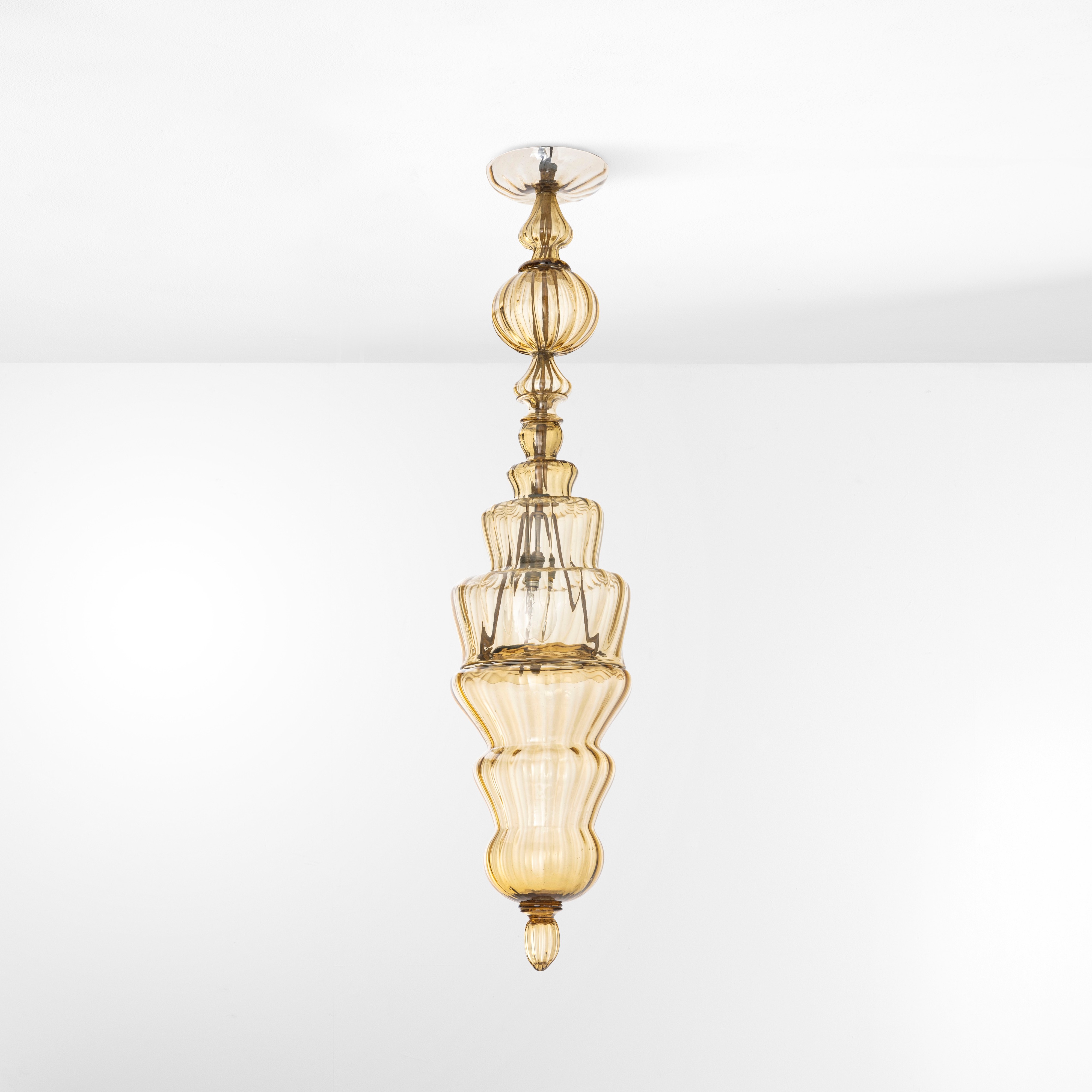 Struttura in metallo e vetro di Murano soffiato e colorato.