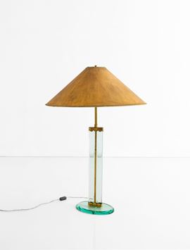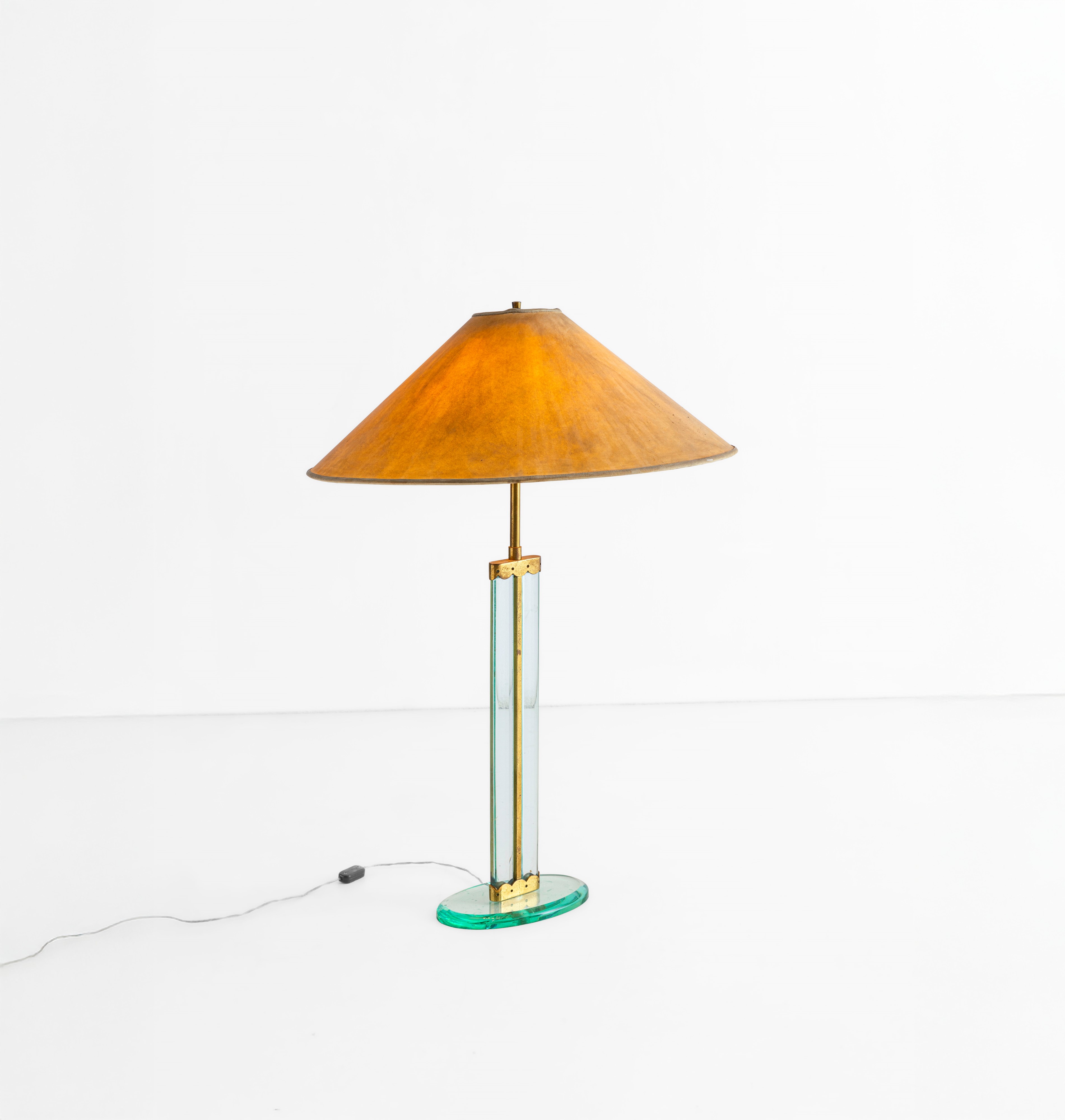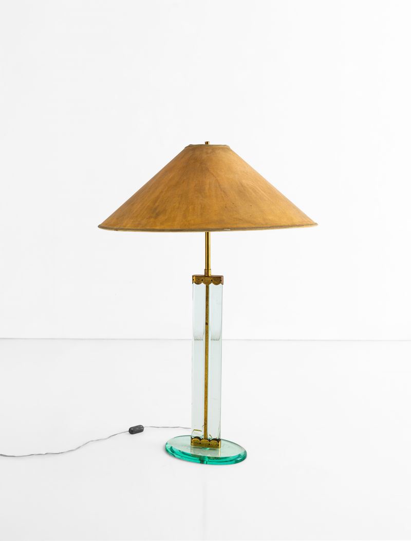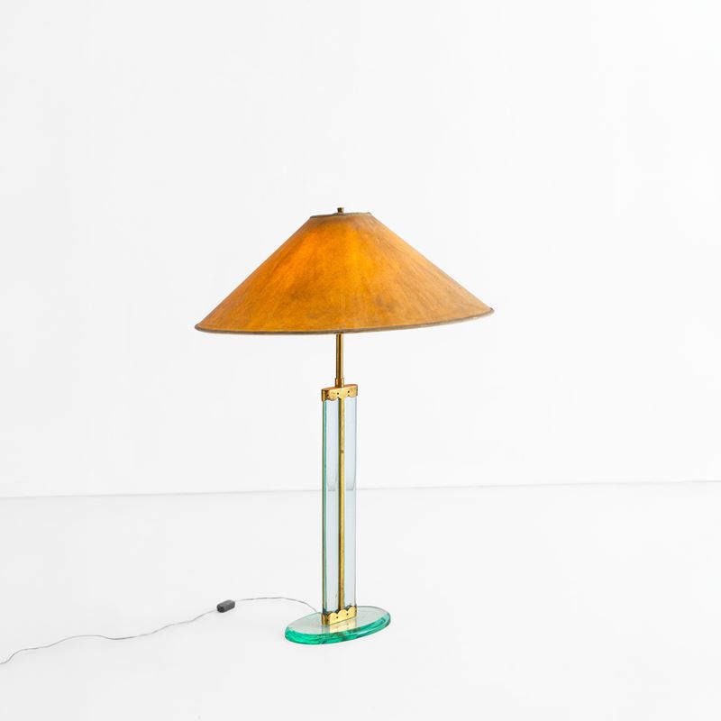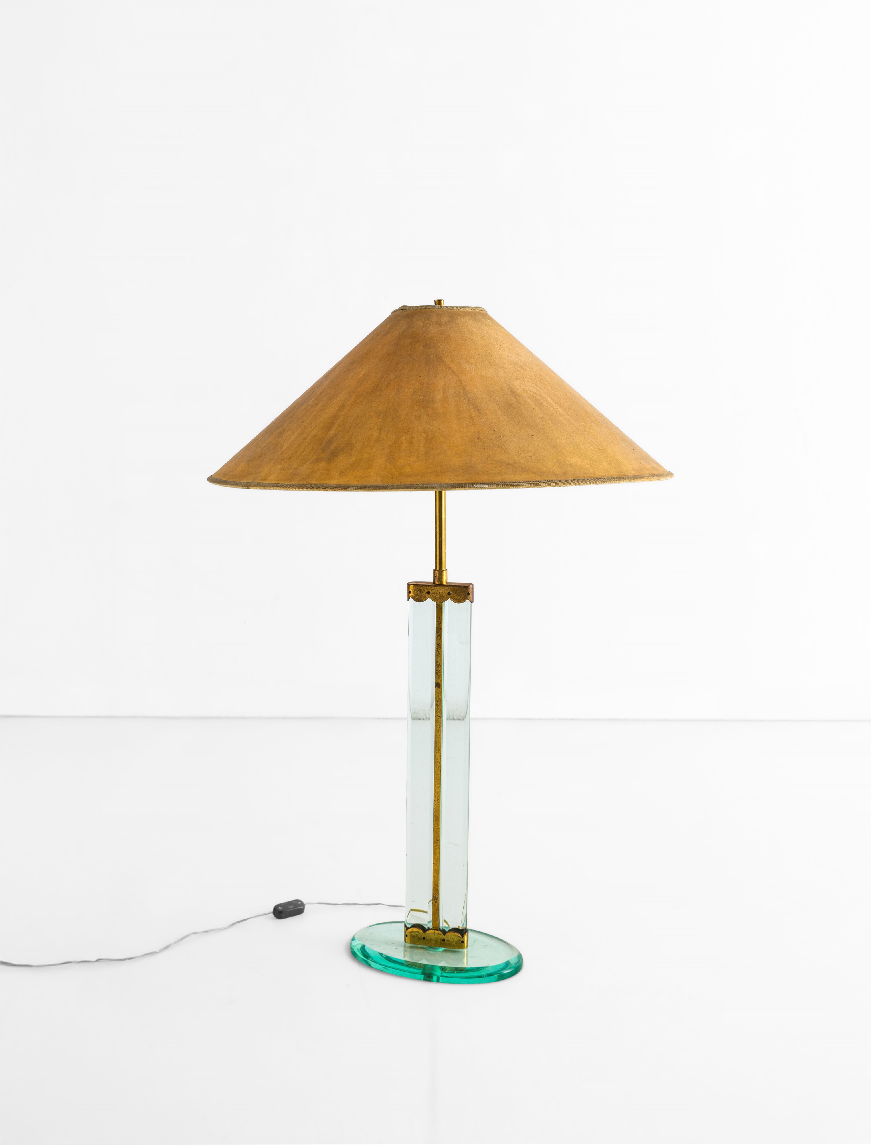 Struttura in cristallo molato con dettagli in ottone e paralume in tessuto.