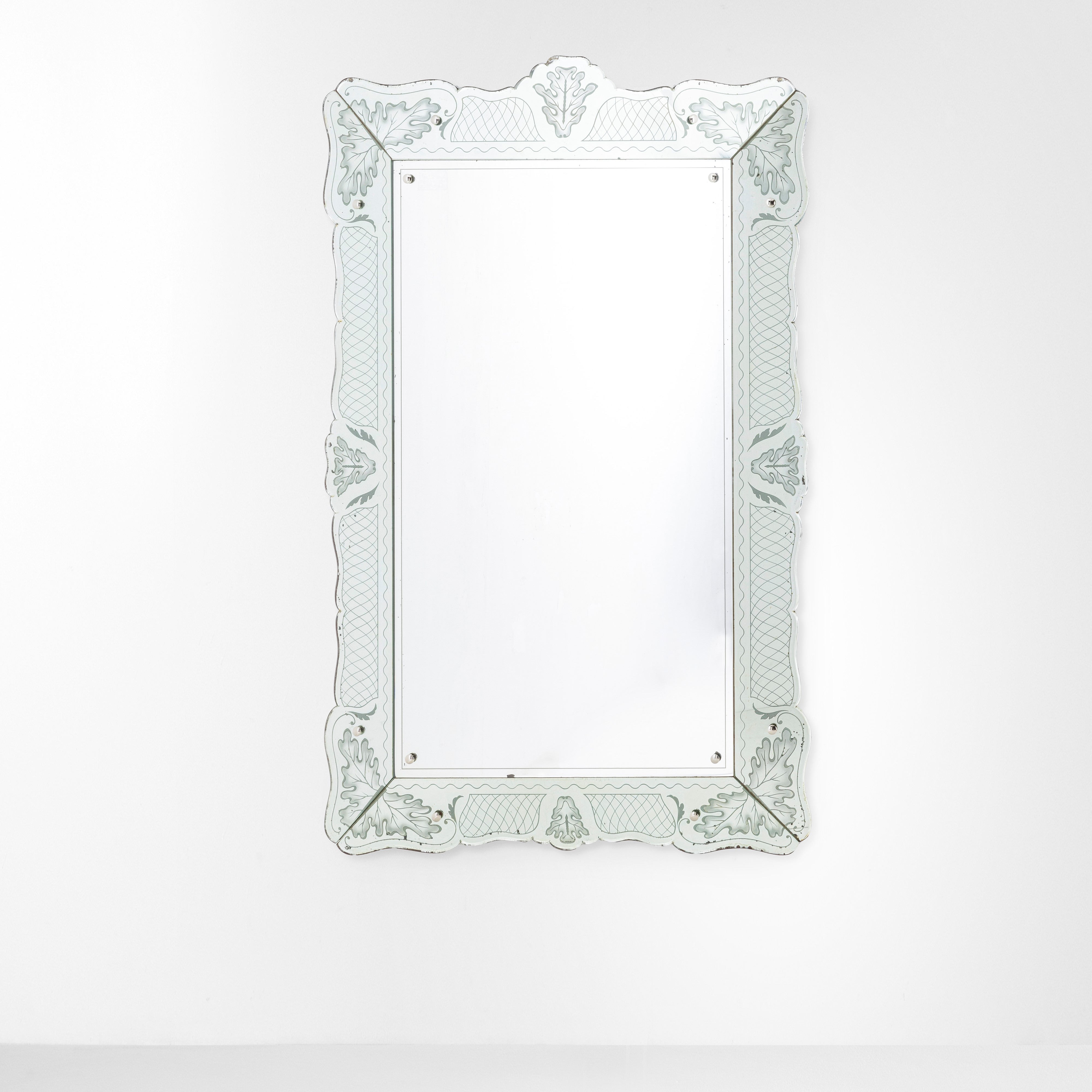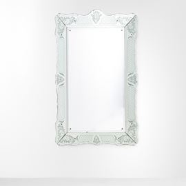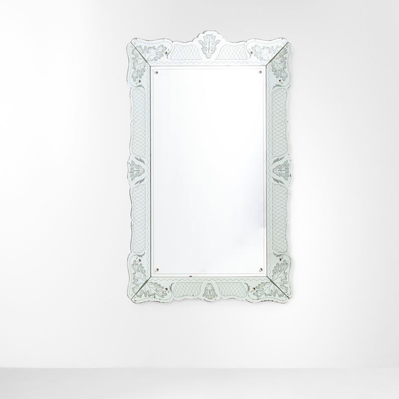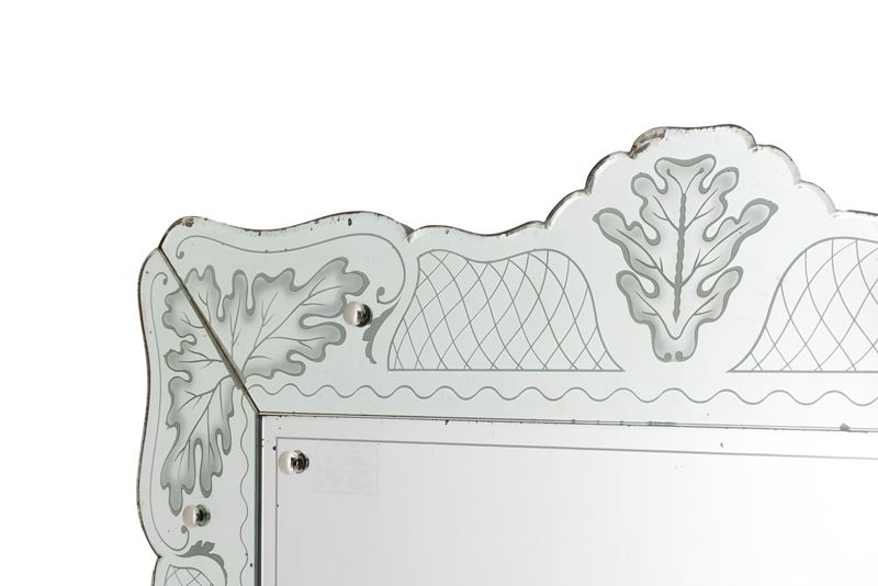 Struttura in legno, cornice in cristallo decorato a getto di sabbia e argentato.