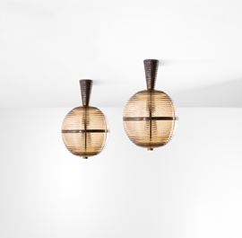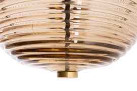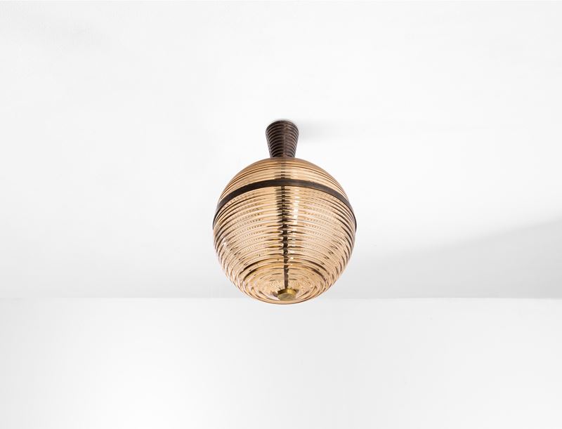 Struttura in ottone e diffusori in vetro di Murano cordonato.