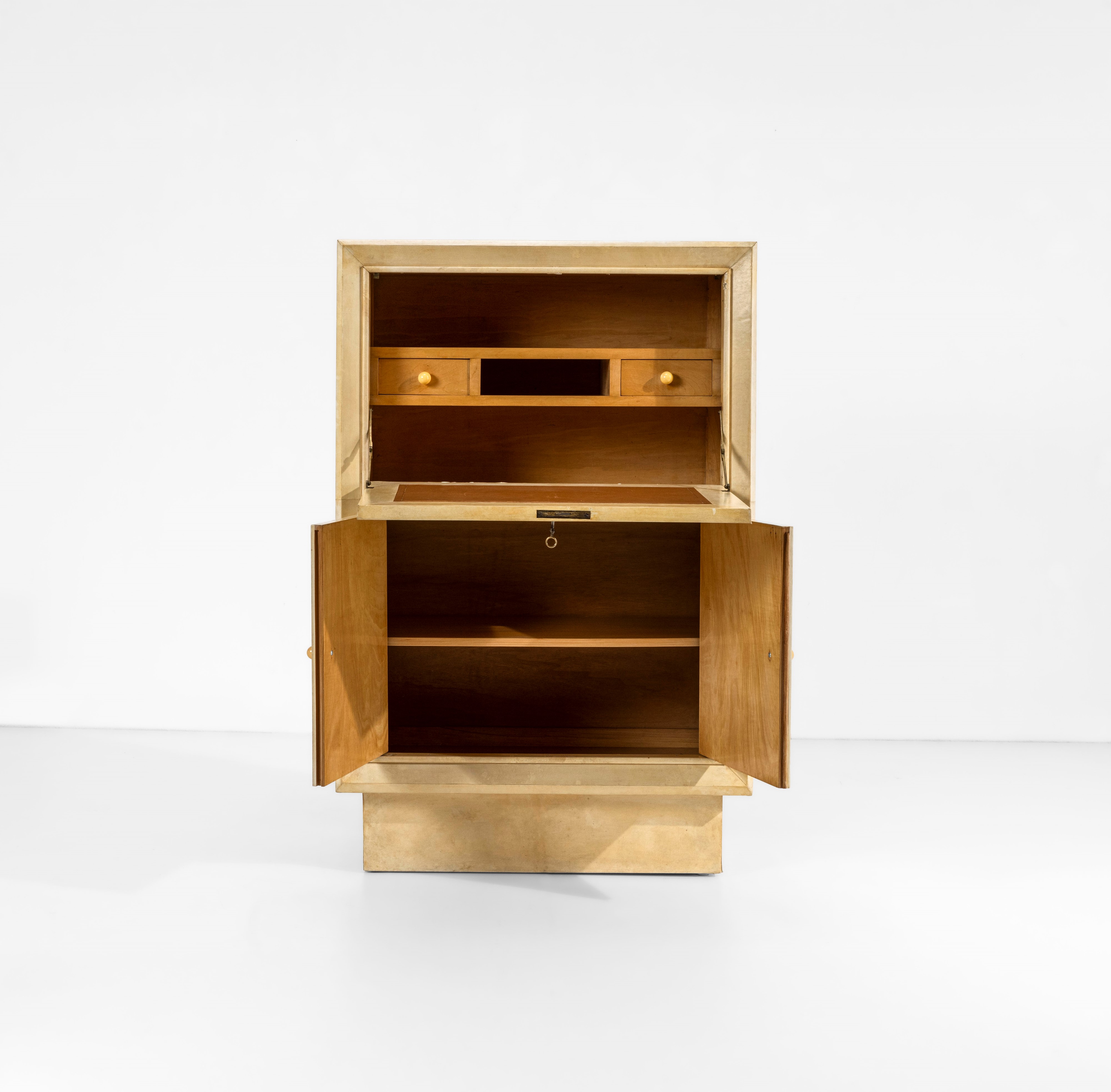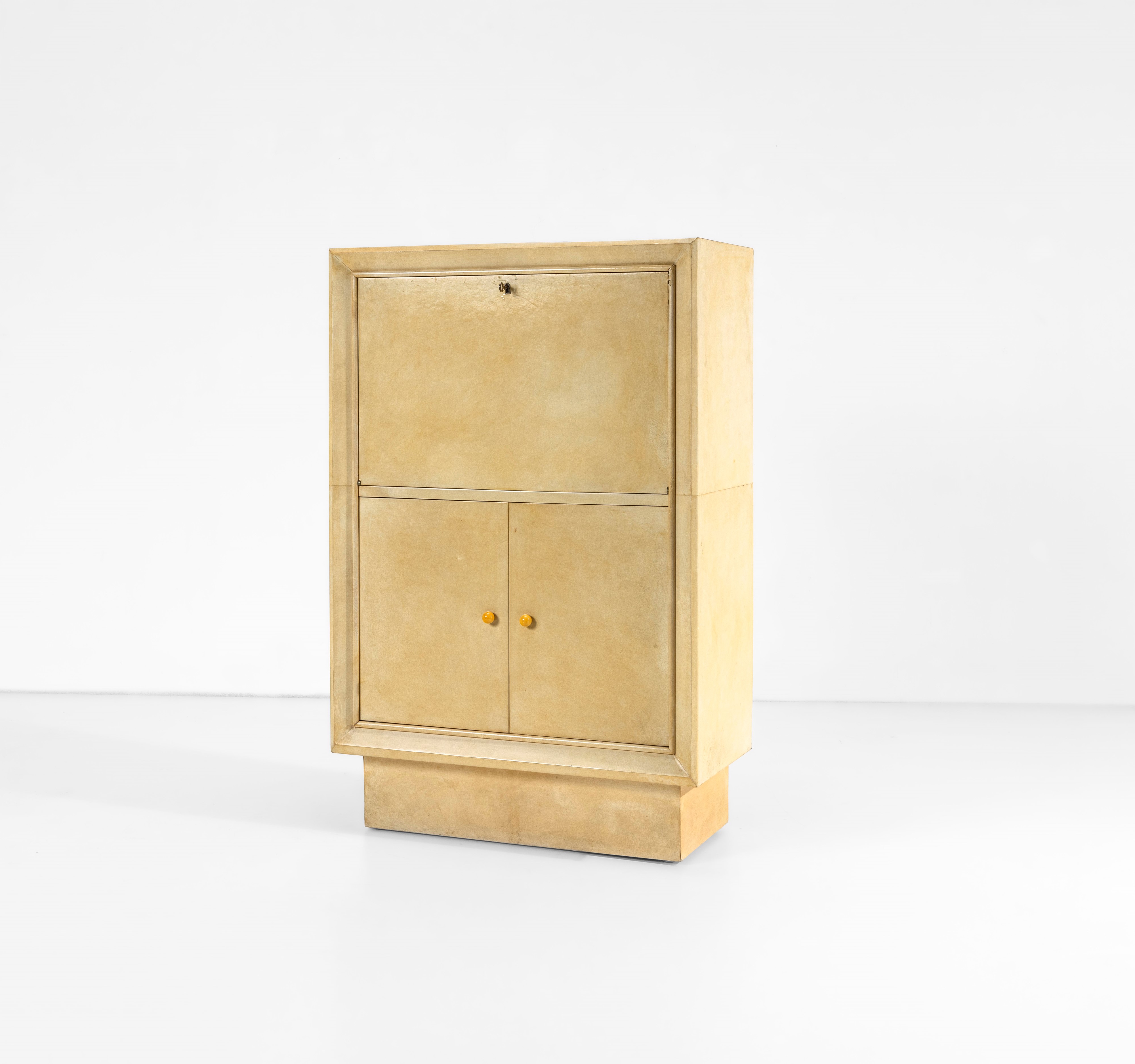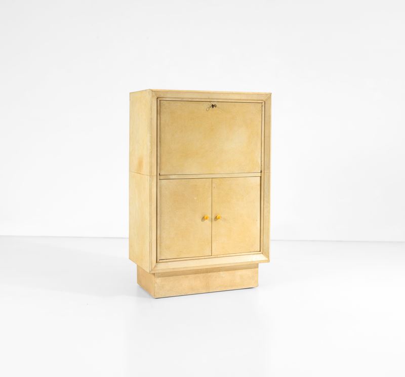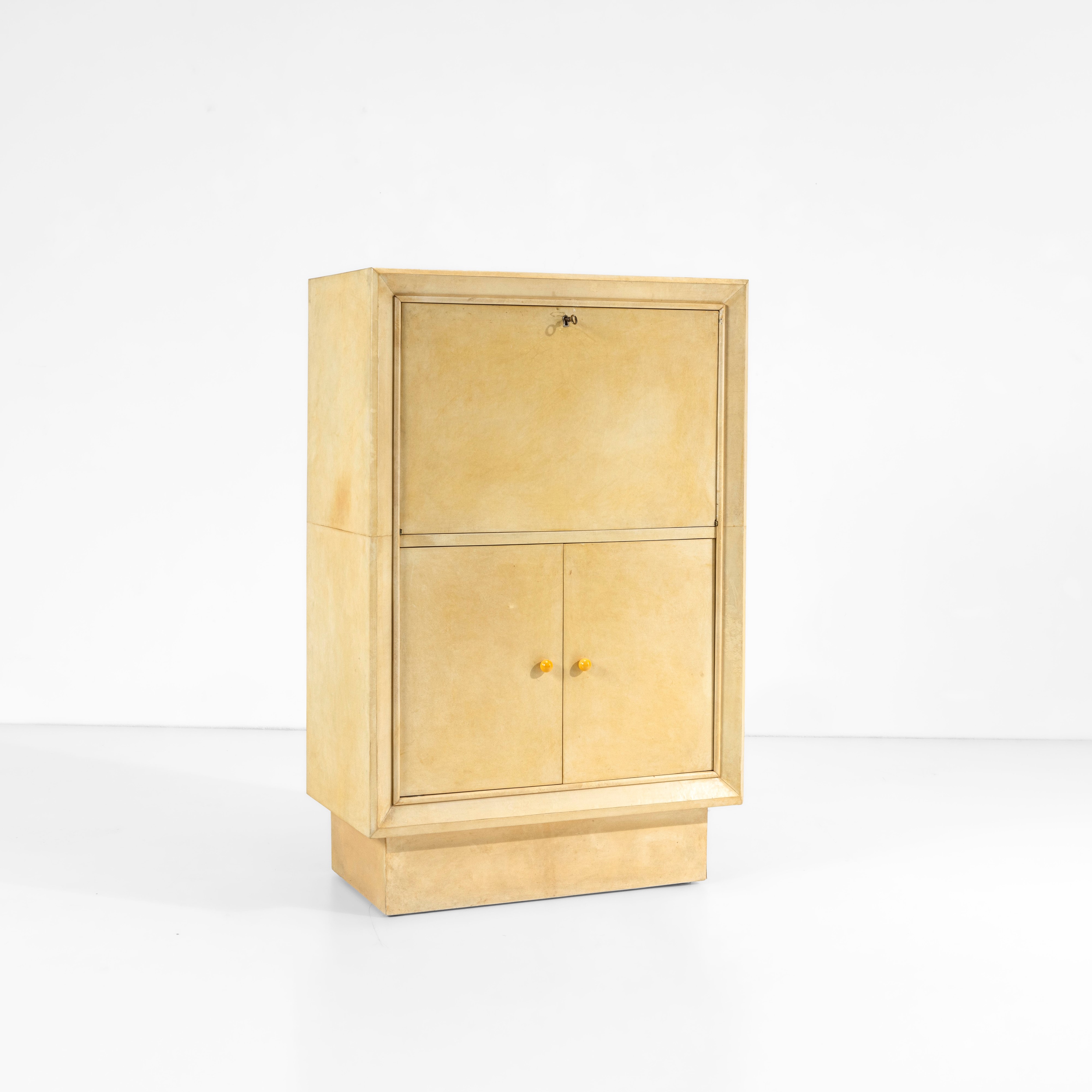 Struttura in legno rivestito di pergamena. Particolari in metallo e maniglie in bachelite.