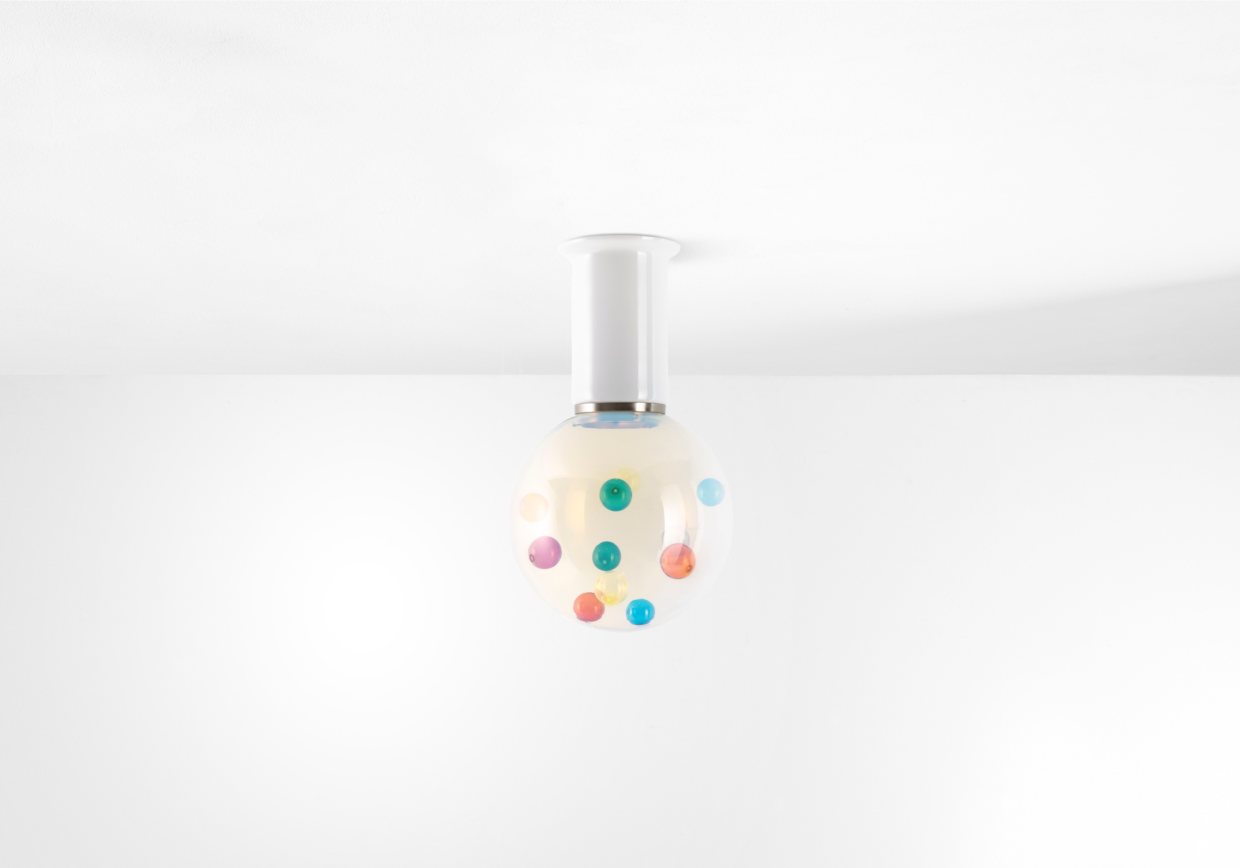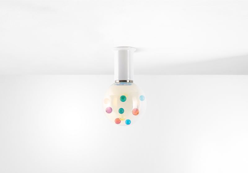 Struttura in vetro soffiato, vetro opalino e metallo nichelato.