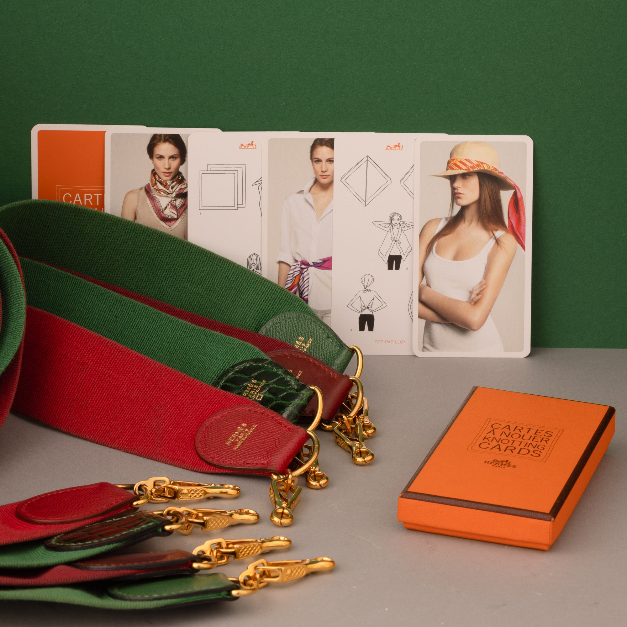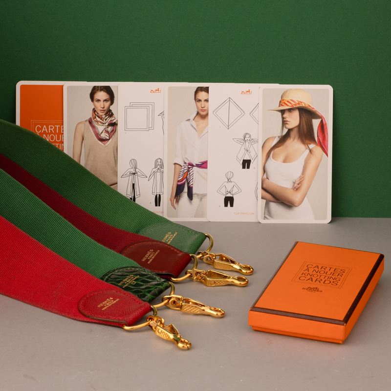 Lotto di 4 tracolle Hermes in tela e pelle + 1 scatolina Hermes "Cartes a nouer knotting cards