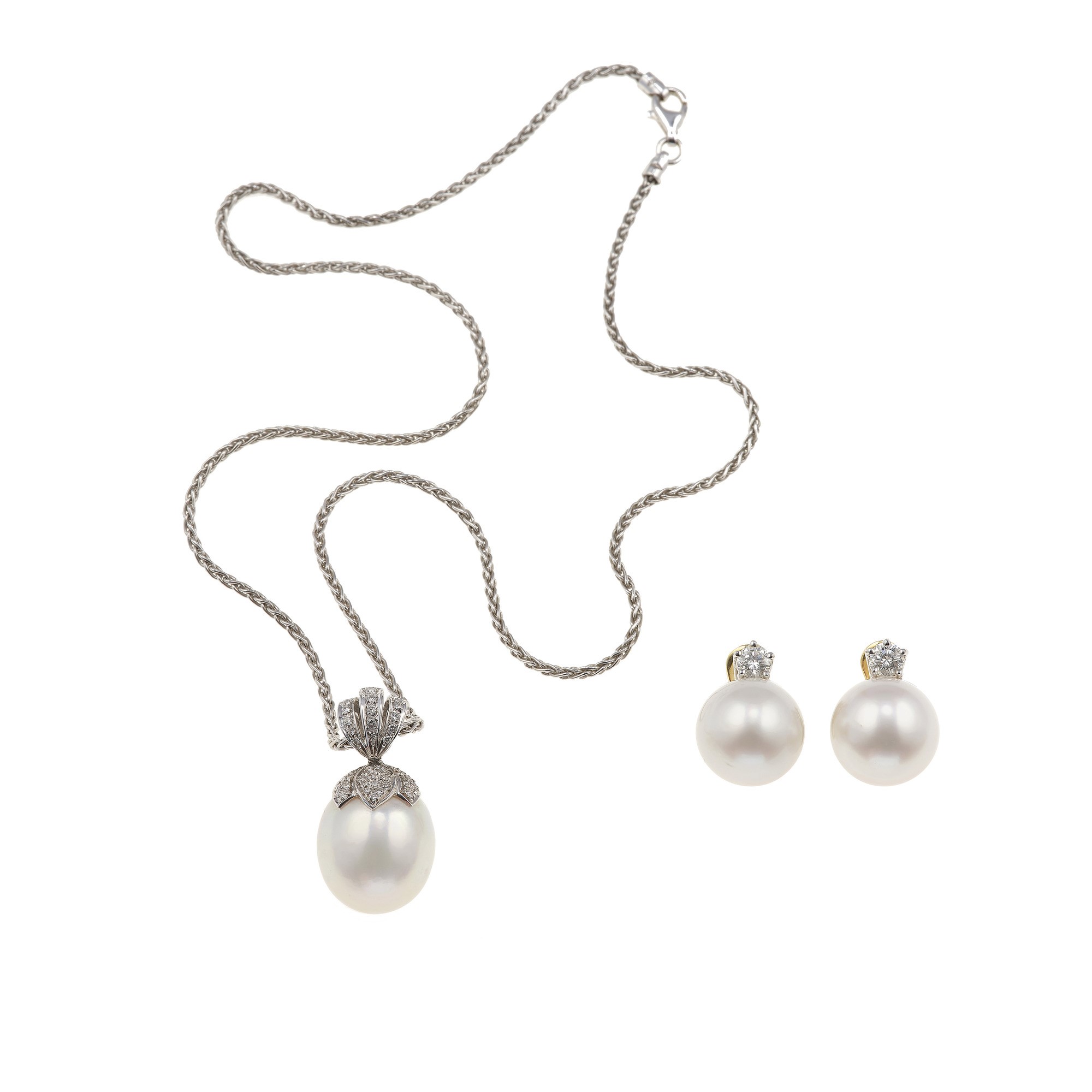 Demi-parure composta da un paio di orecchini ed un pendente con perle coltivate e diamanti