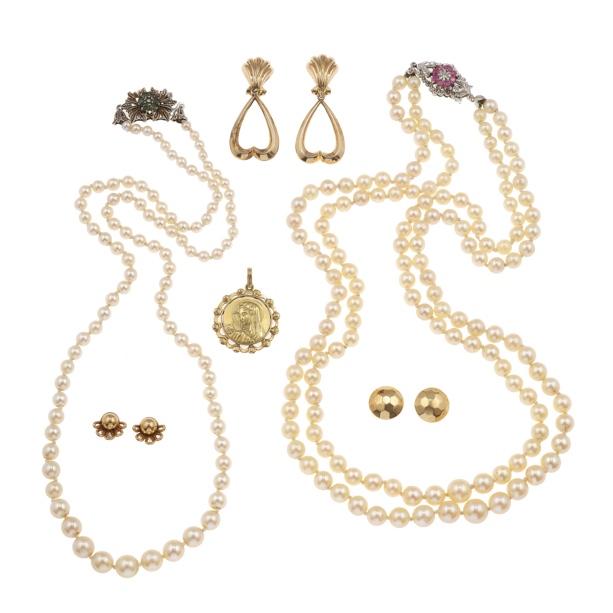 Lotto composto da due collane con perle coltivate, tre paia di orecchini ed un pendente