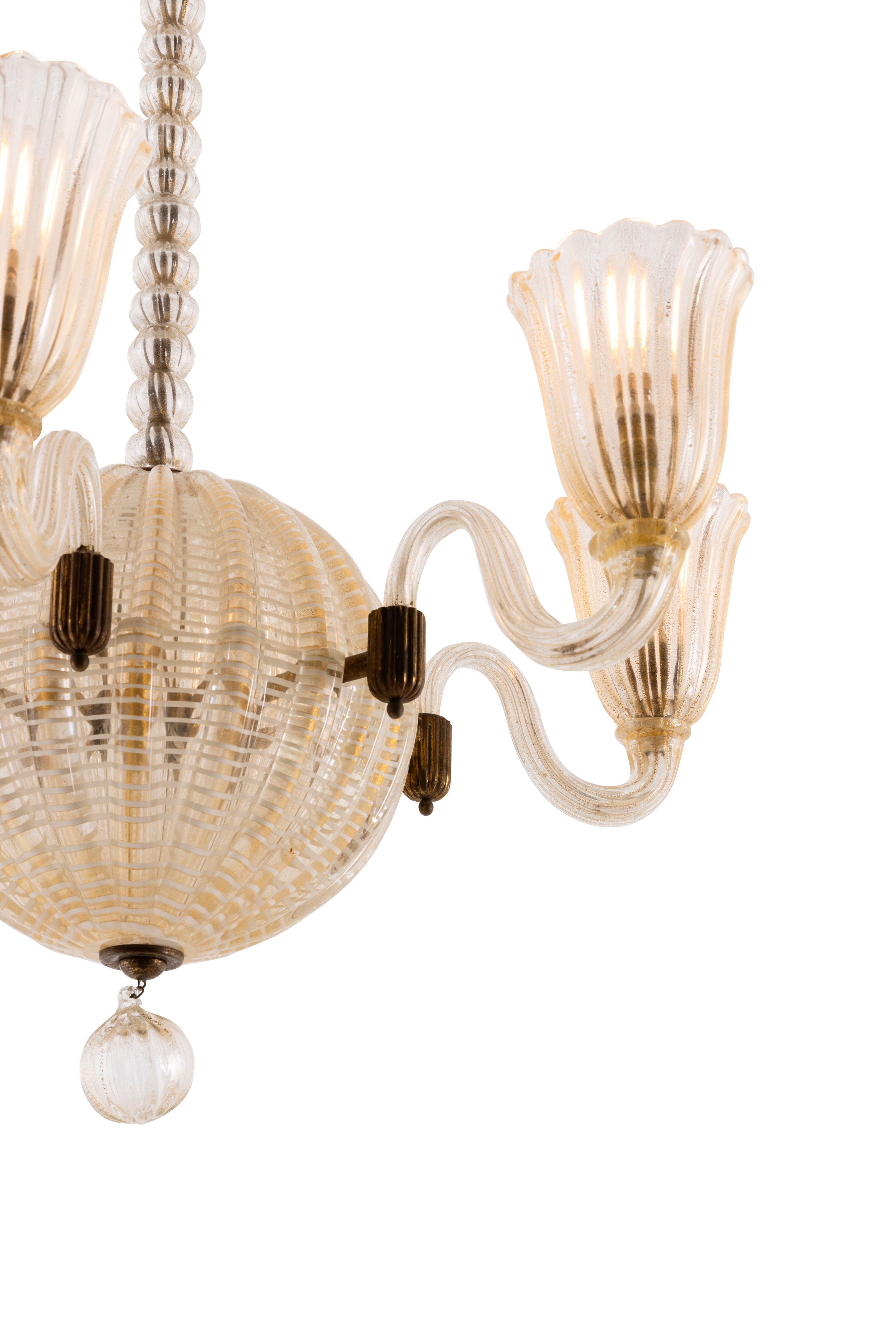 Struttura in ottone ed elementi diffusori in vetro di Murano con inclusioni in oro.