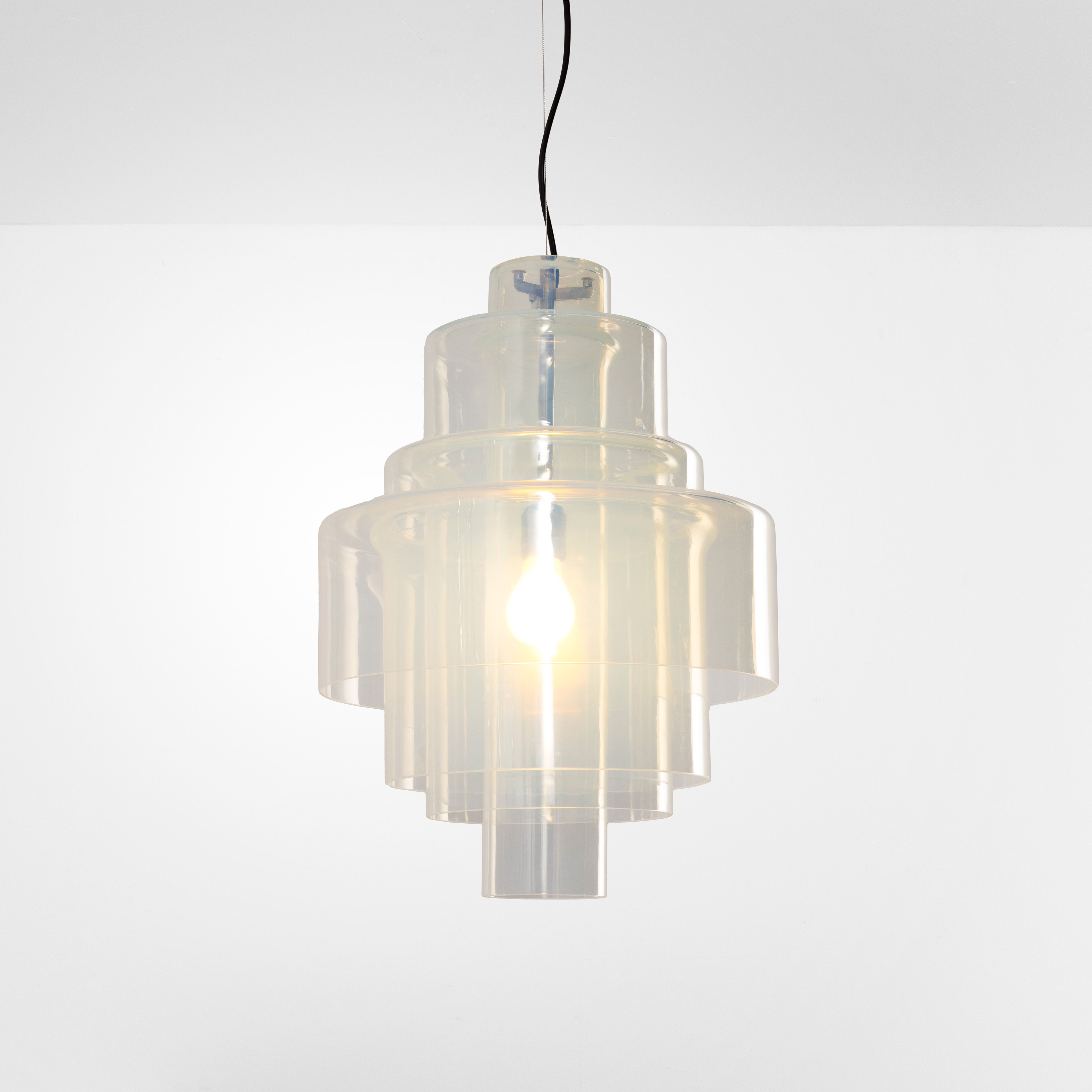 Struttura ad altezza regolabile in metallo e diffusori in vetro di Murano opalescente.