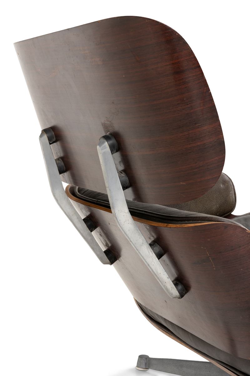 Struttura in legno compensato curvato sagomato e impiallacciato. Sostegni in alluminio e seduta con rivestimenti in pelle.