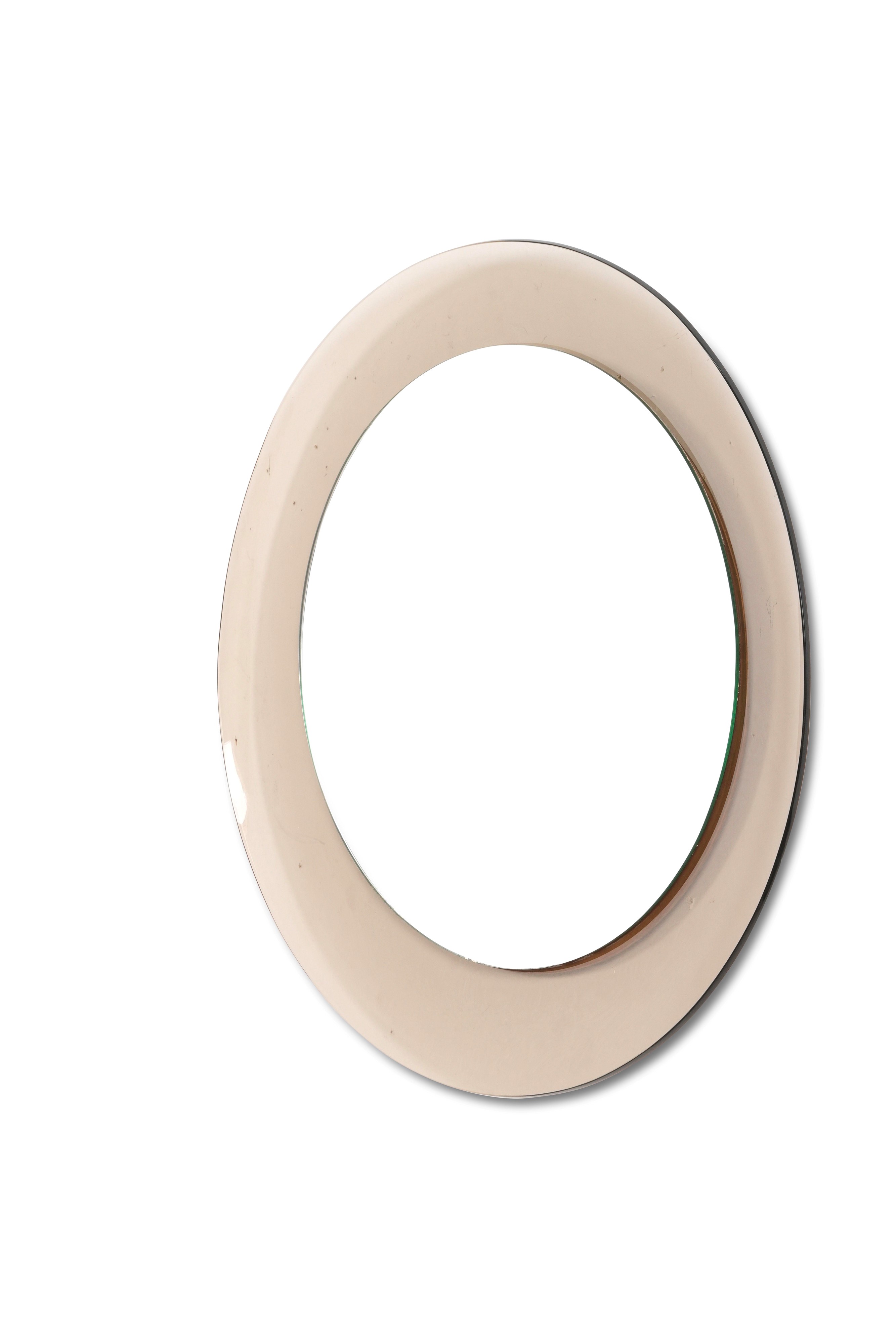 Struttura in legno, cornice in cristallo curvato e cristallo specchiato.