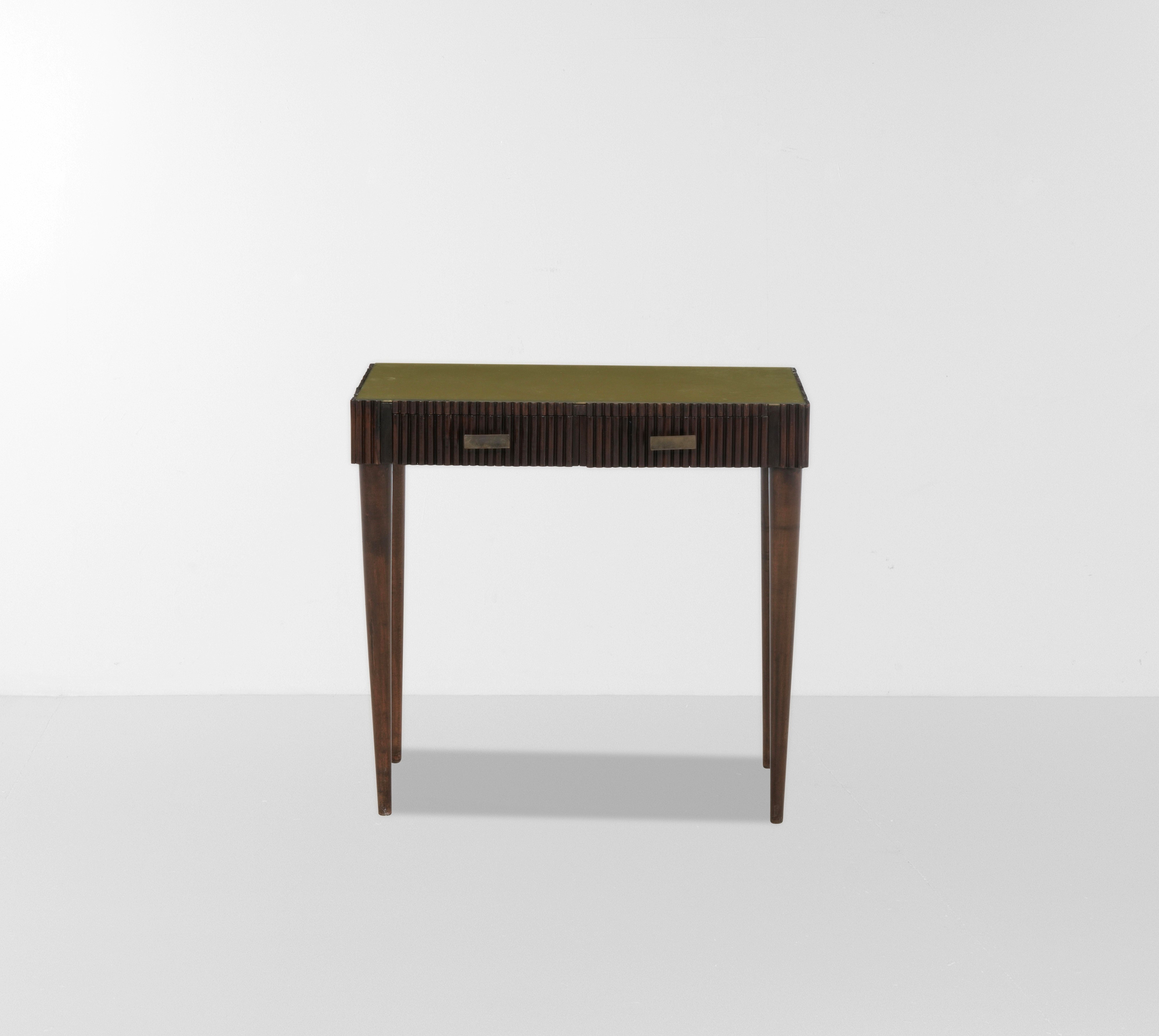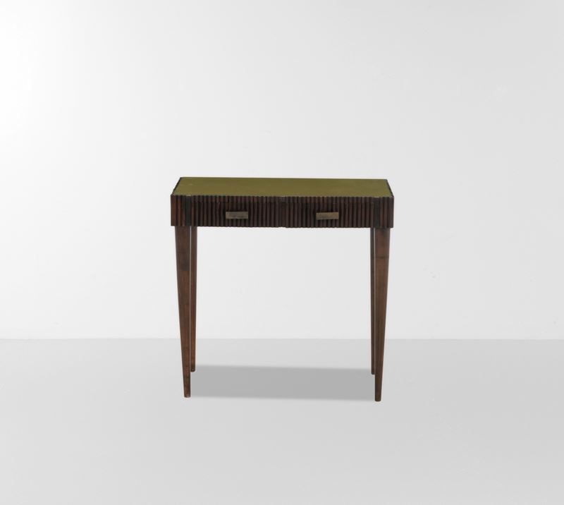 Sostegni in legno, struttura e cassetti in legno grissinato. Maniglie in ottone e piano in cristallo colorato.