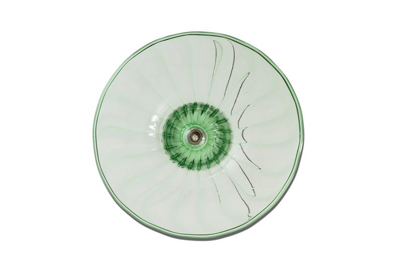 Struttura in ottone e vetro di Murano soffiato e colorato.