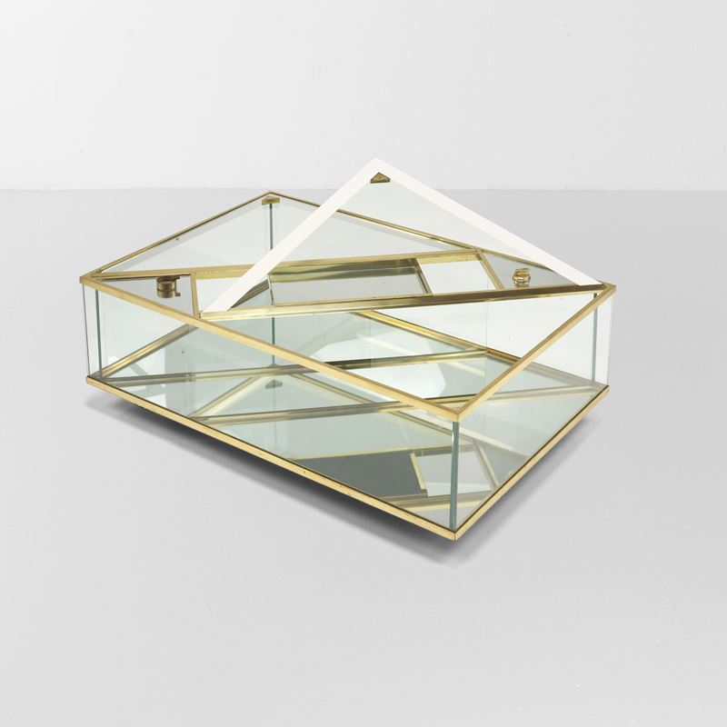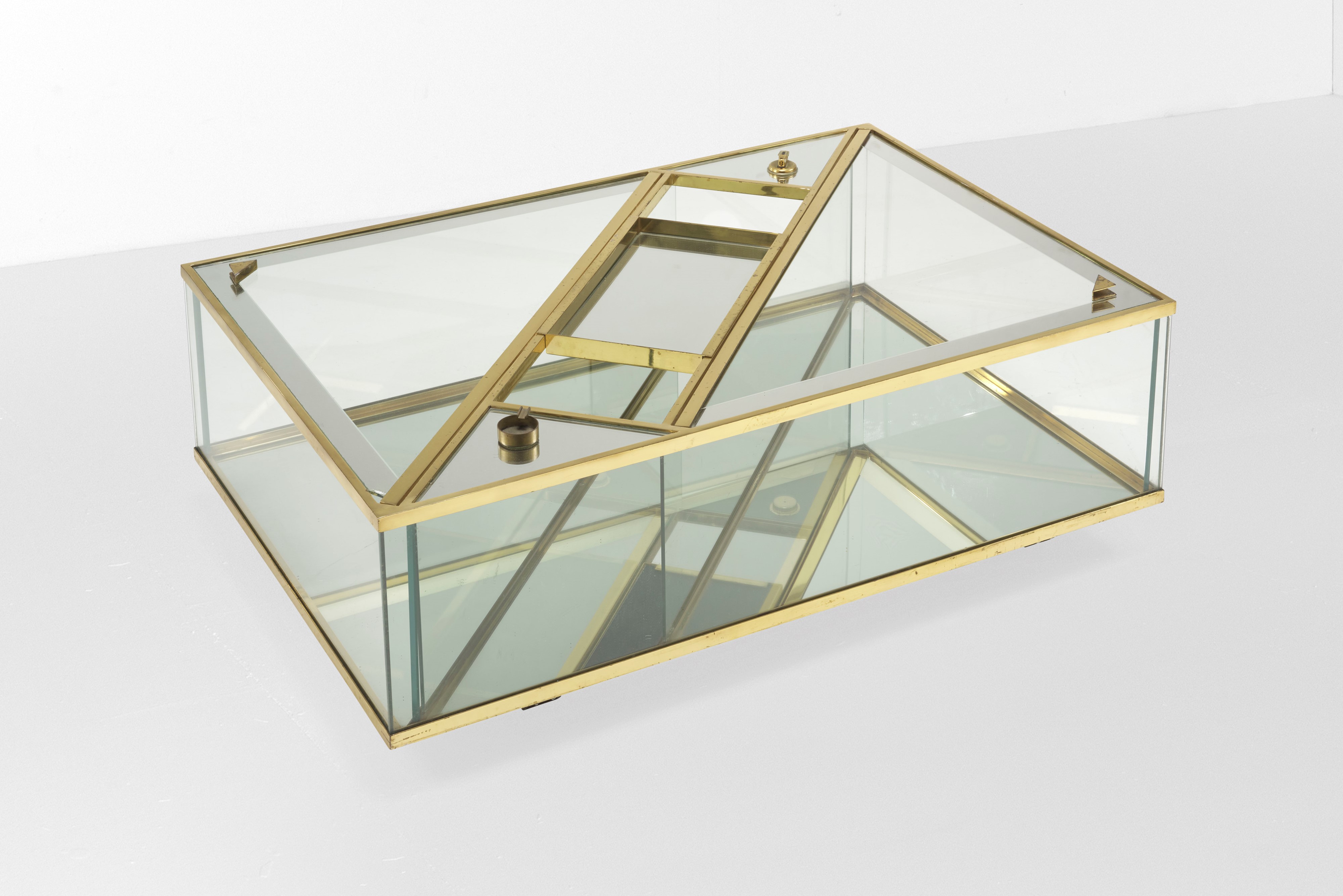 Struttura in ottone e cristallo parzialmente specchiato. Vani contenitori con maniglie in ottone. Dettagli in ottone. Ruote in gomma.