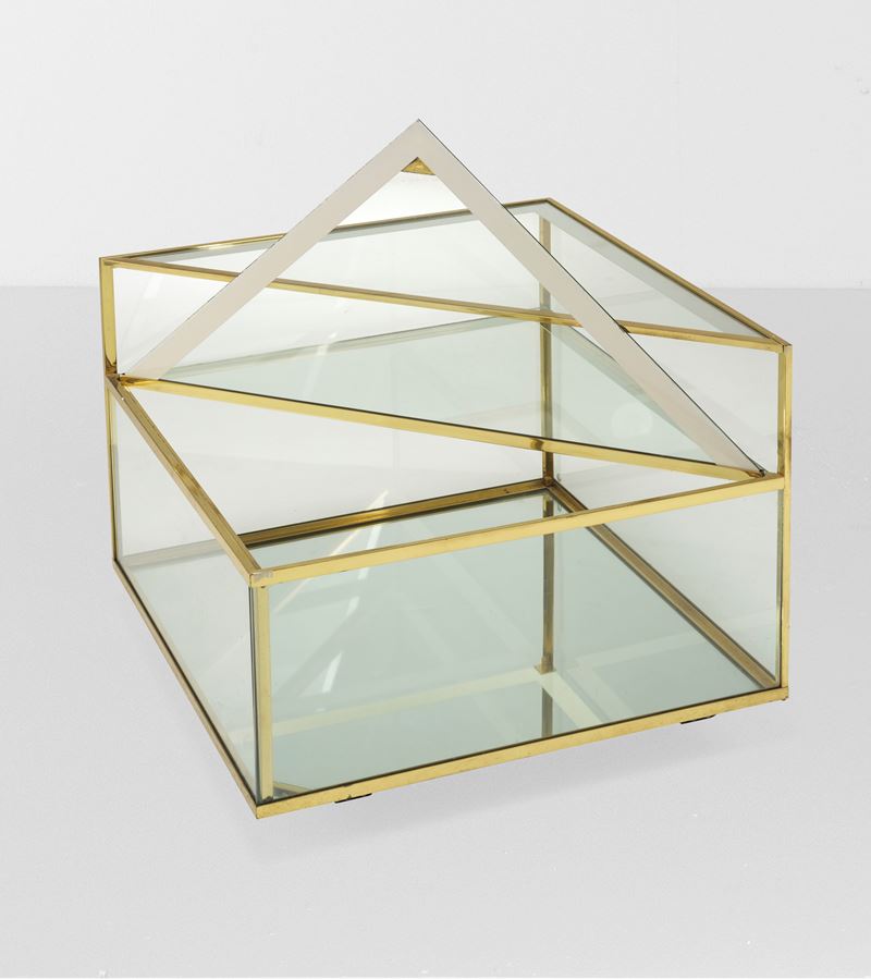 Struttura in ottone e cristallo parzialmente specchiato. Vani contenitori con maniglie in ottone. Ruote in gomma.