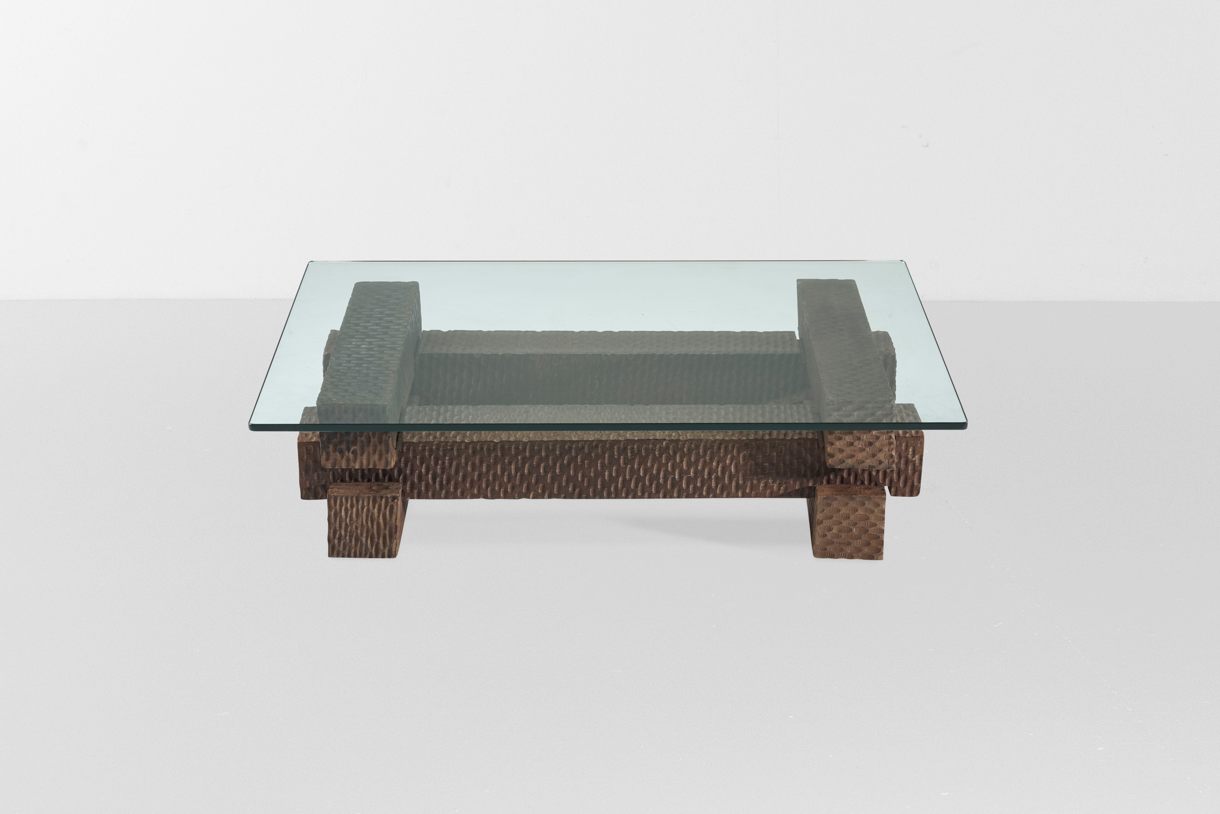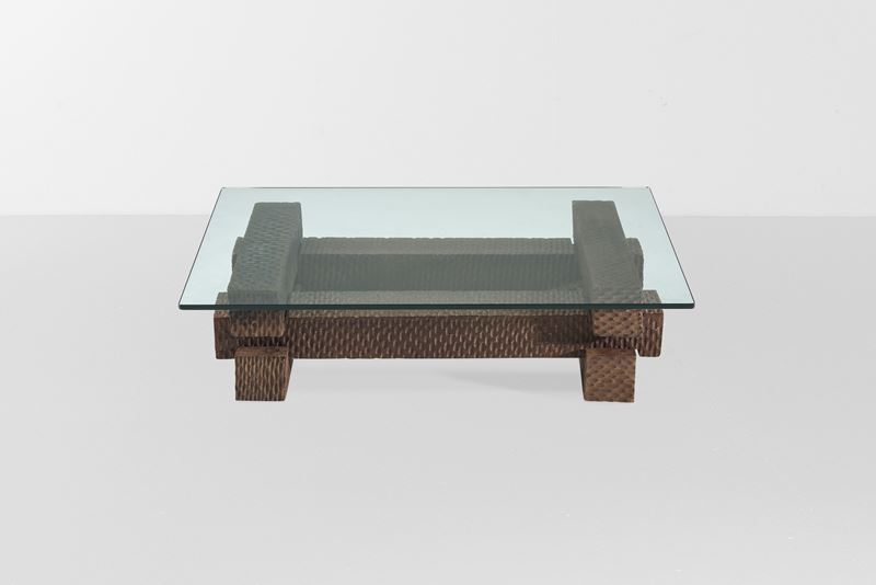 Base composta da elementi in legno massello scolpito. Piano in cristallo molato di forte spessore.