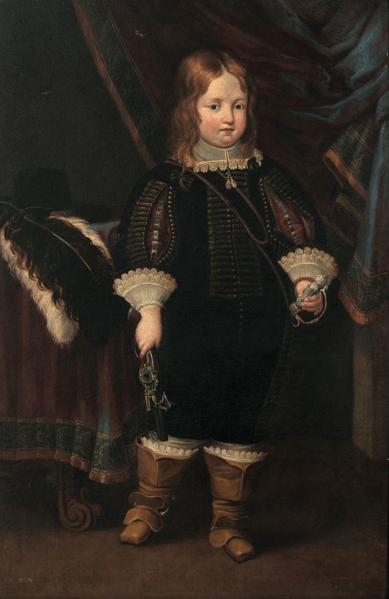 Scuola del Nord Europa del XVII secolo Ritratto di infante con pistola a ruota e spadino