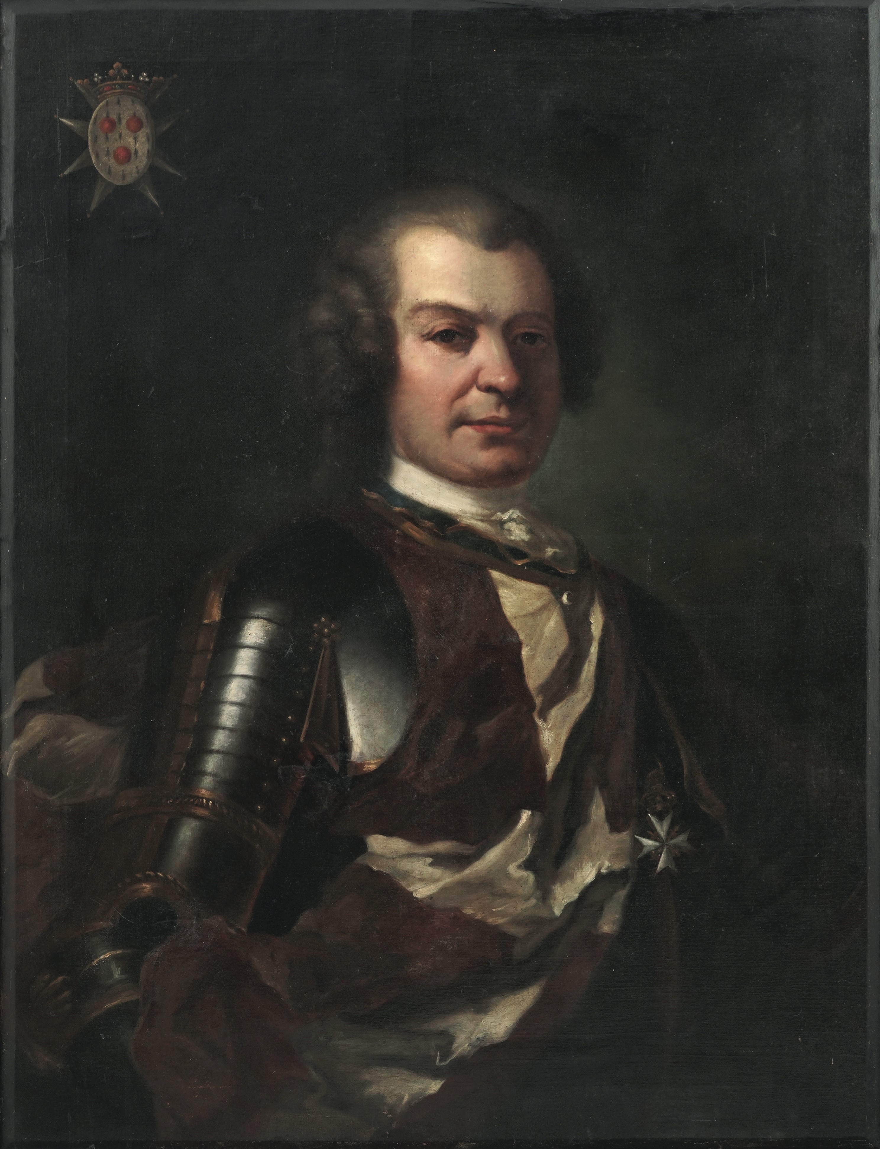 Scuola del XX secolo Ritratto di gentiluomo in armatura con stemma