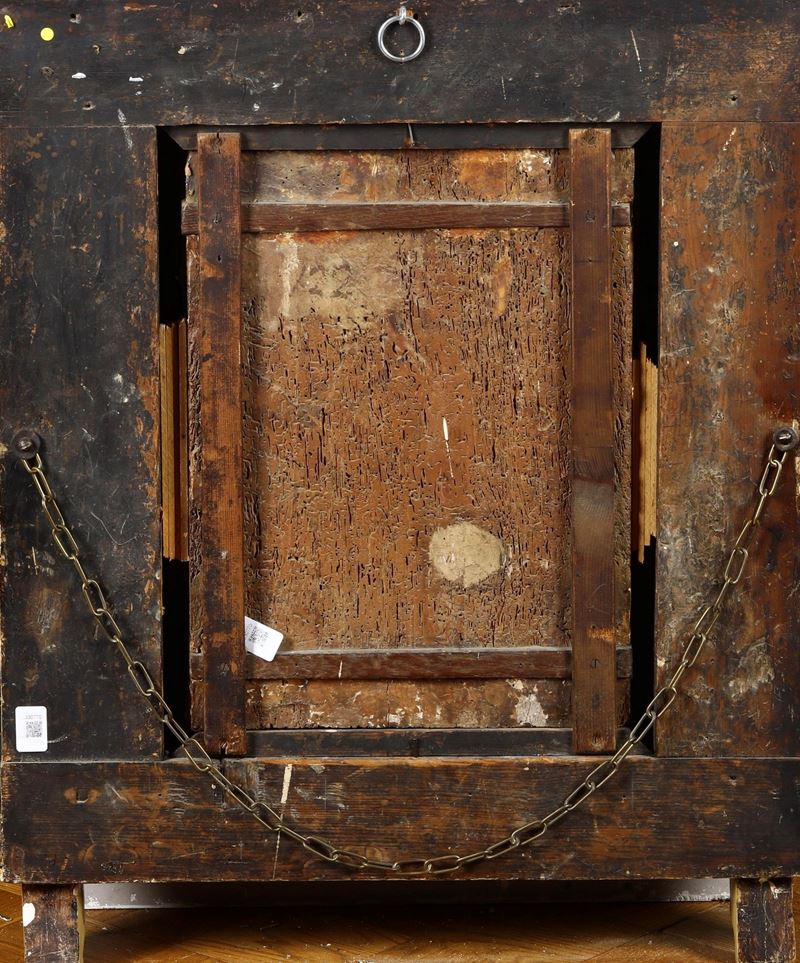 entro cornice a tempietto in legno laccato e dorato