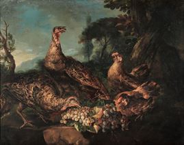 Considerato uno dei migliori pittori di animali del panorama artistico italiano tra XVII e XVIII secolo, Angelo Maria Crivelli, conosciuto anche come Crivellone, nel corso della sua vita lavorò al servizio sia della grande nobiltà lombarda sia della corte sabauda, realizzando opere di grande impatto scenico e che ben rispondevano al gusto decorativo dell’epoca, come per esempio le celebri tele per la palazzina di caccia di Stupinigi o quelle attualmente conservate all’interno dello studio del presidente della Repubblica al Quirinale. Specializzato nella raffigurazione di animali, in queste composizioni Crivelli ci dona anche un’incredibile resa paesaggistica, ambientando le scene all’interno di lussureggianti parchi e paesaggi che si estendono a perdita d’occhio, nei quali una ricca varietà di volatili sono ritratti dall’artista con massimo naturalismo.