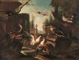 Considerato uno dei migliori pittori di animali del panorama artistico italiano tra XVII e XVIII secolo, Angelo Maria Crivelli, conosciuto anche come Crivellone, nel corso della sua vita lavorò al servizio sia della grande nobiltà lombarda sia della corte sabauda, realizzando opere di grande impatto scenico e che ben rispondevano al gusto decorativo dell’epoca, come per esempio le celebri tele per la palazzina di caccia di Stupinigi o quelle attualmente conservate all’interno dello studio del presidente della Repubblica al Quirinale. Specializzato nella raffigurazione di animali, in queste composizioni Crivelli ci dona anche un’incredibile resa paesaggistica, ambientando le scene all’interno di lussureggianti parchi e paesaggi che si estendono a perdita d’occhio, nei quali una ricca varietà di volatili sono ritratti dall’artista con massimo naturalismo.