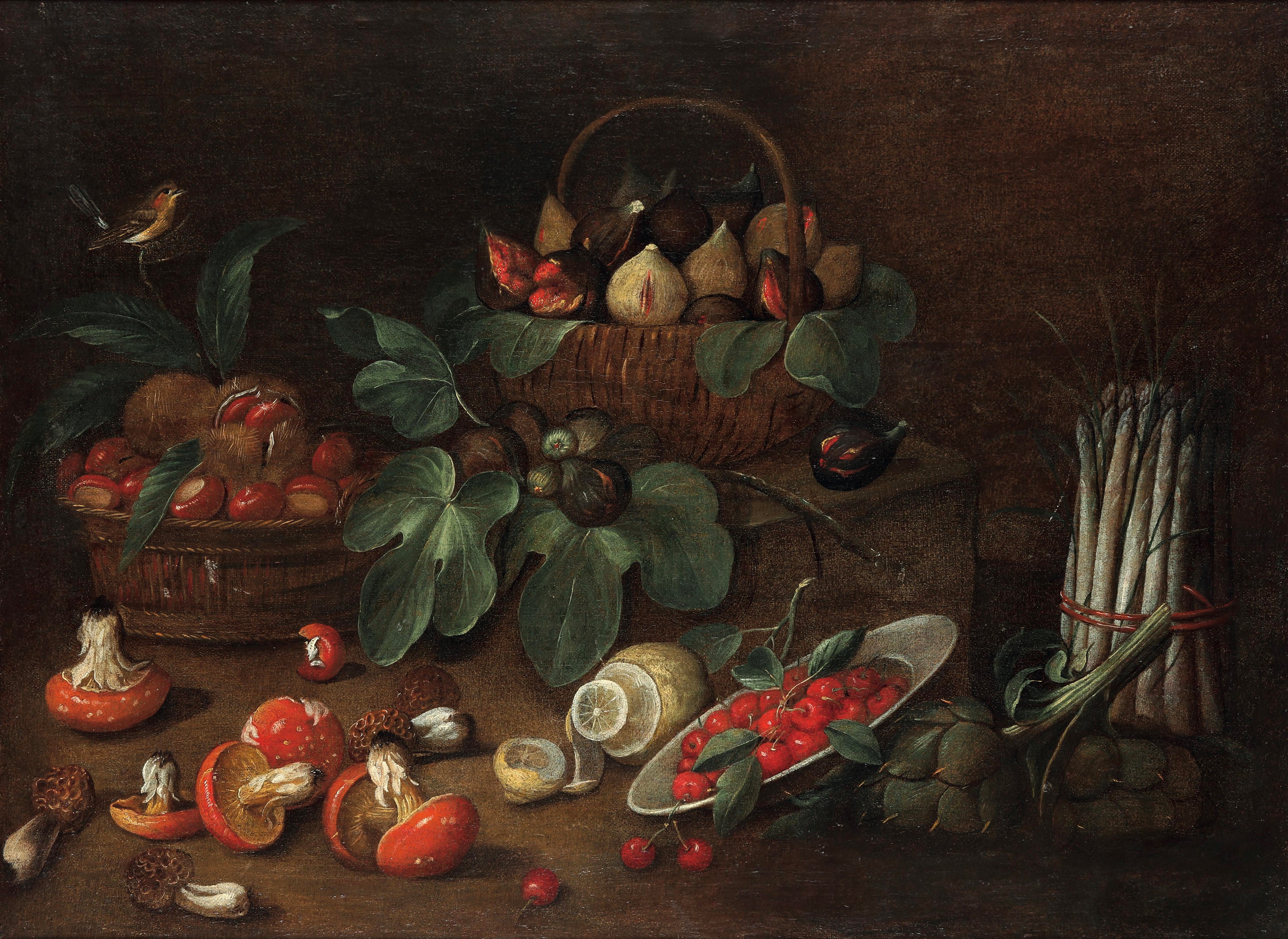 Natura morta con cesto di fichi, castagne, funghi e asparagi