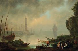 Artista del XVII-XVIII secolo Veduta costiera con faro e personaggi