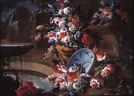 Composizione di fori e porcellane in un giardino con fontana e pavone