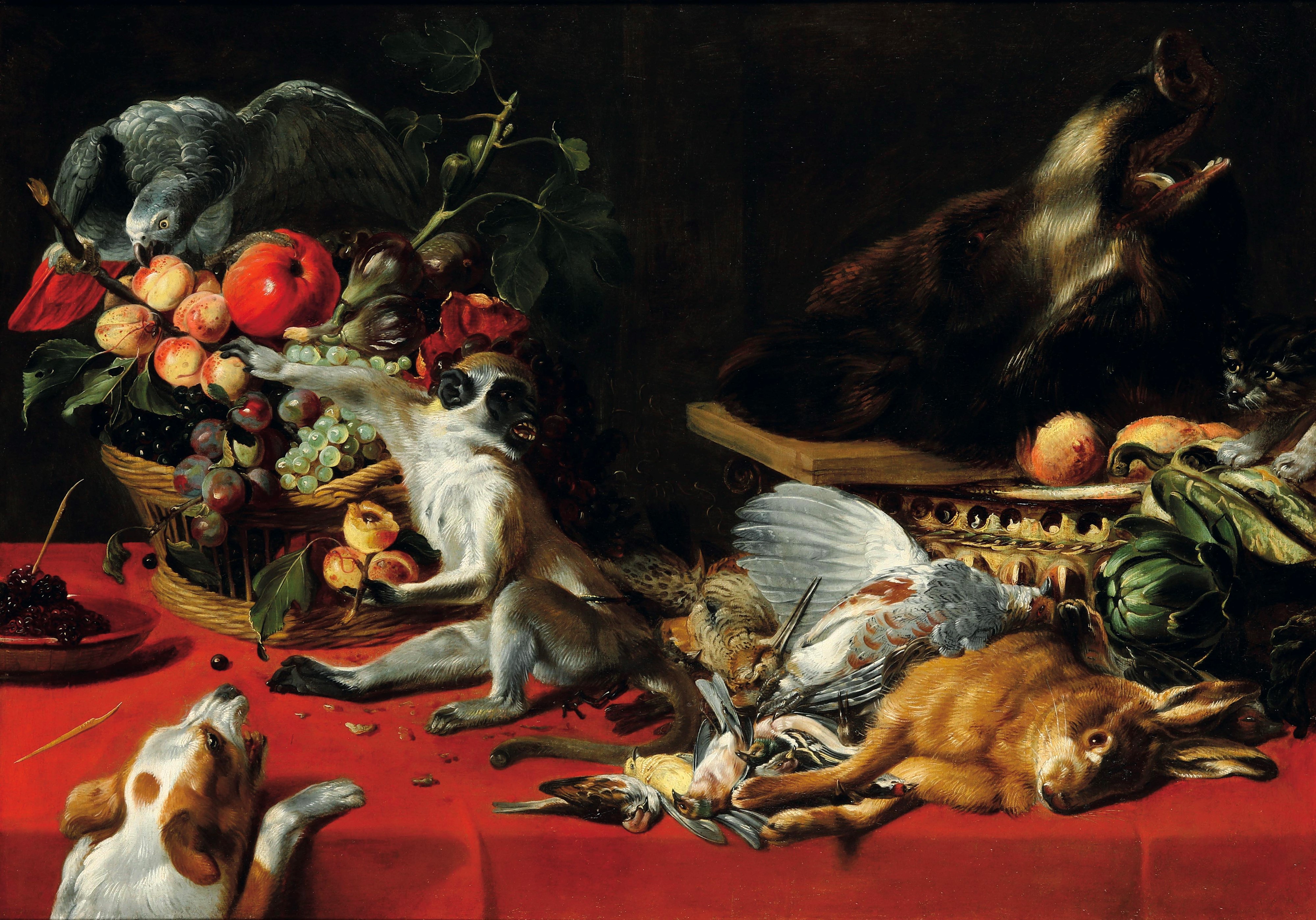 Natura morta con scimmietta, pappagallo, cagnolino e cacciagione