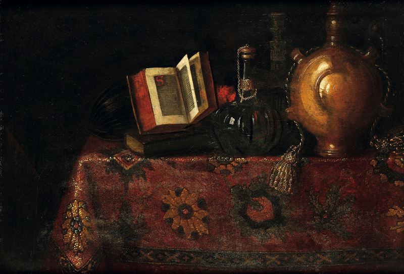 Natura corta con libro, liuto, fiaschi e tappeto