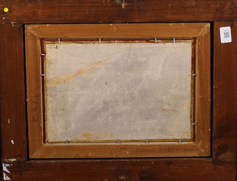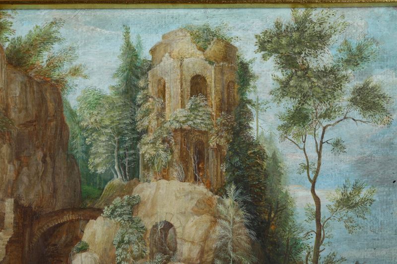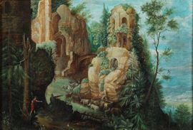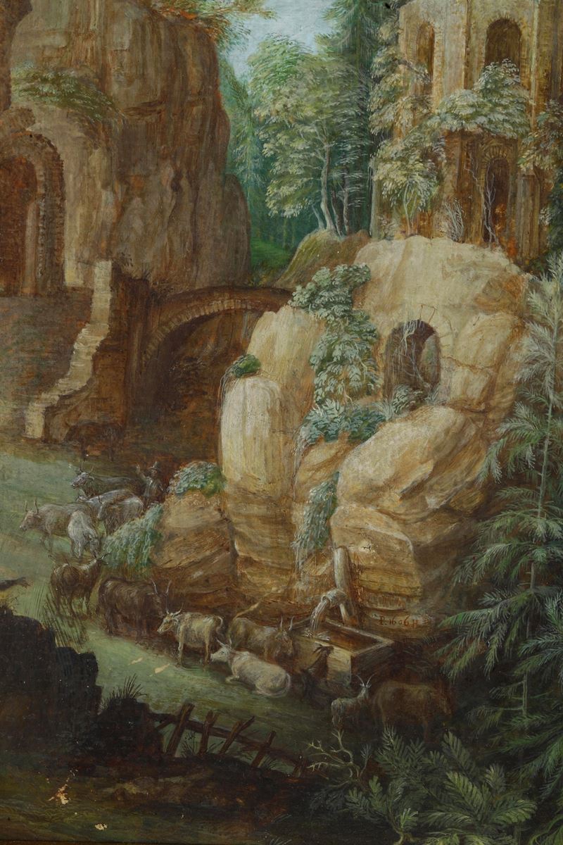 Paesaggio montuoso con pastori e armenti alla fonte