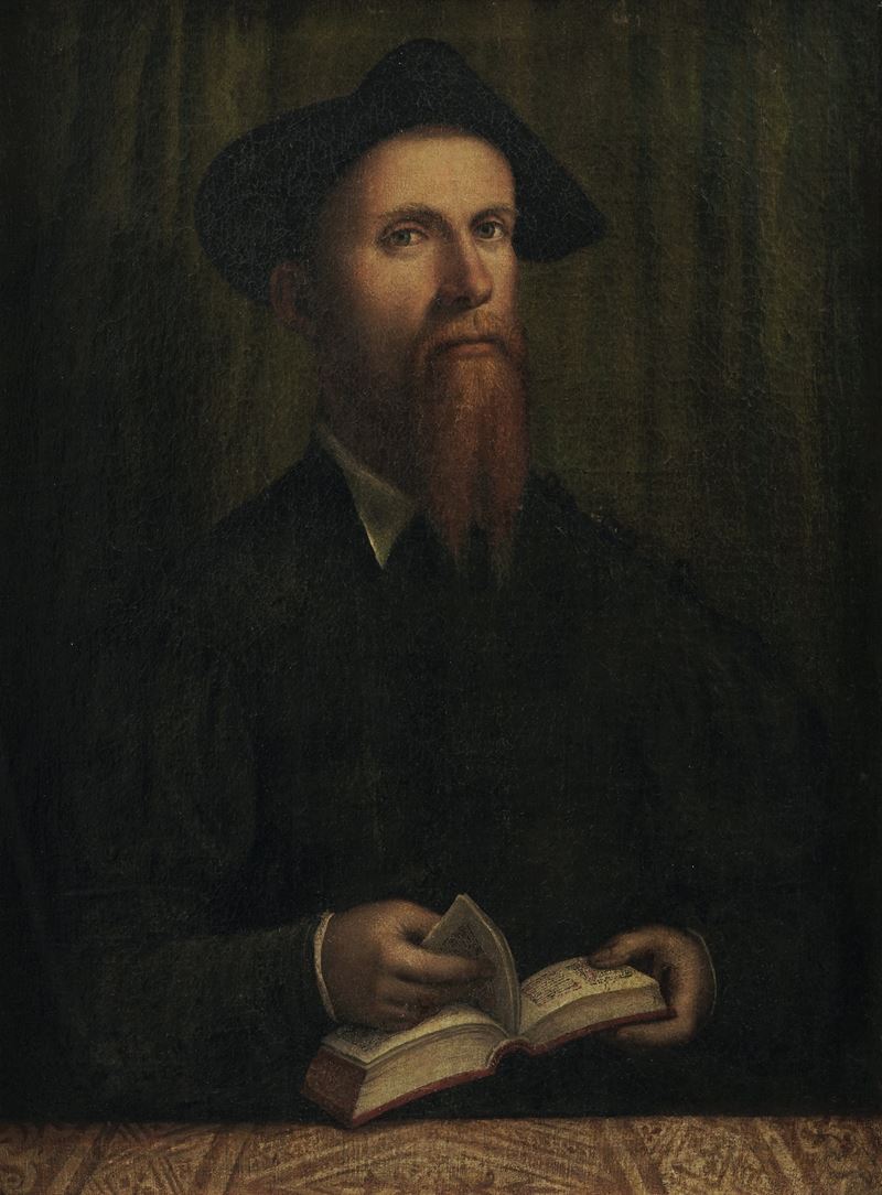 Scuola lombarda del XVI secolo Ritratto di gentiluomo in nero con libro