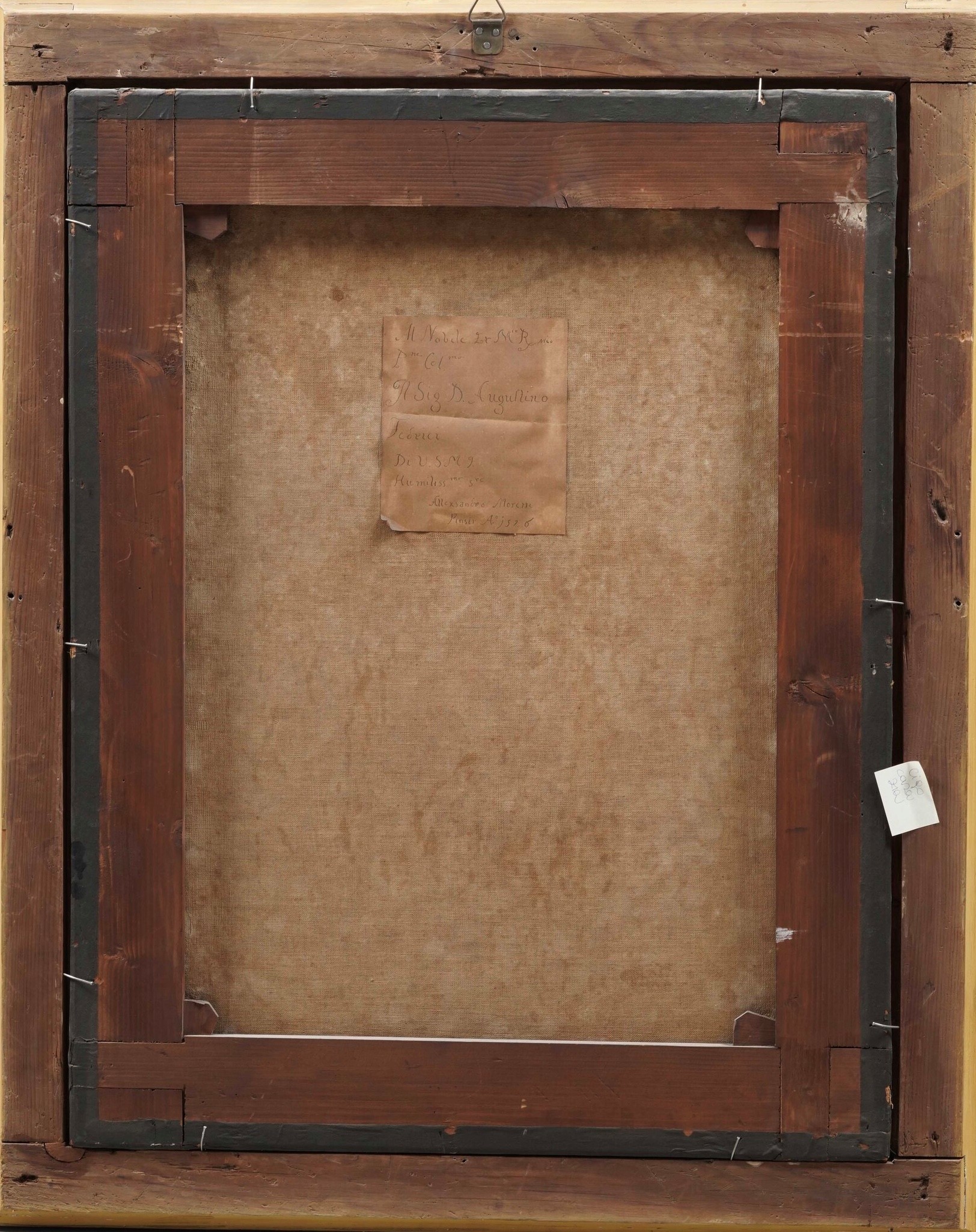 reca al retro cartiglio che sembra riportare una antica iscrizione che doveva essere presente sulla tela