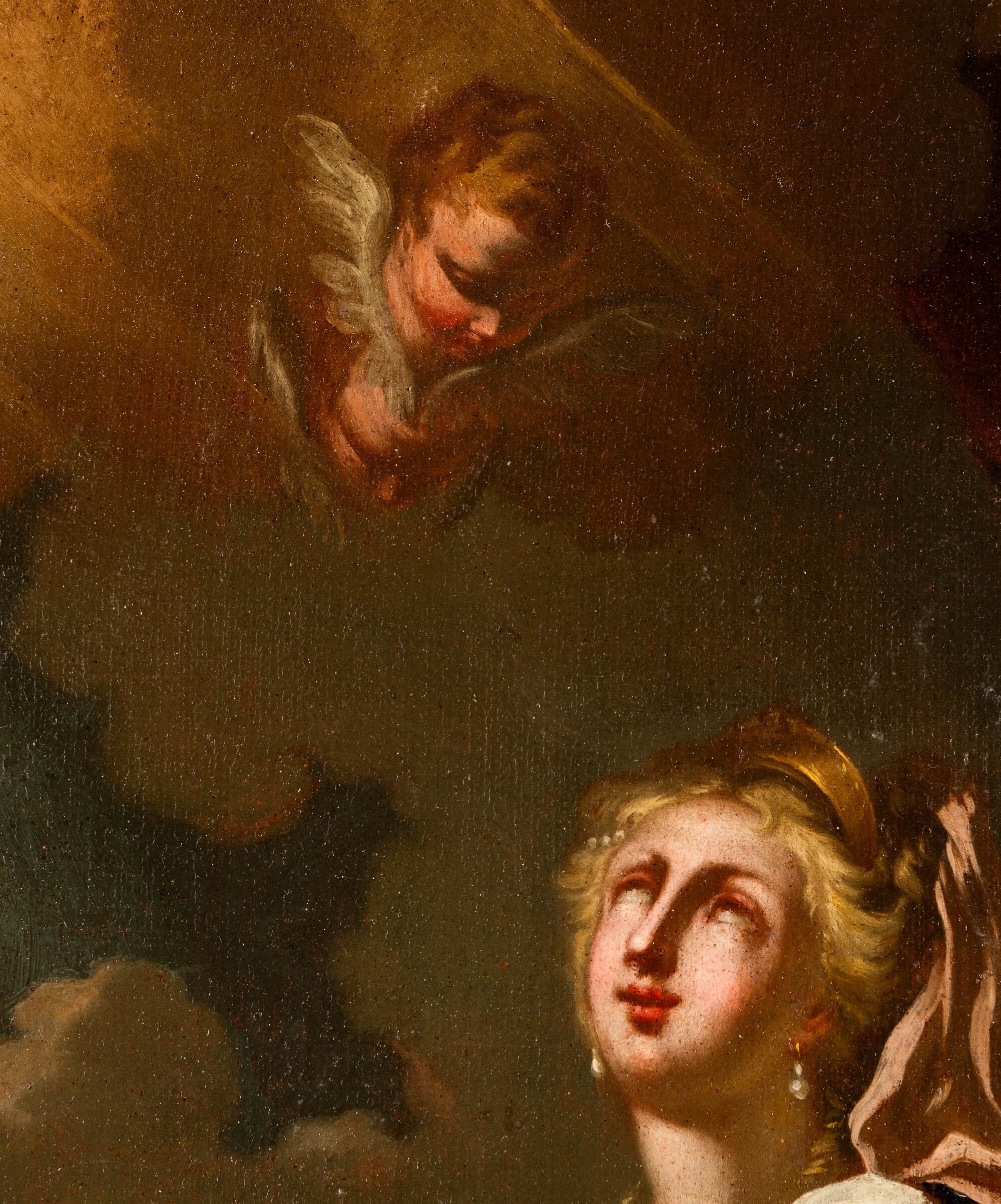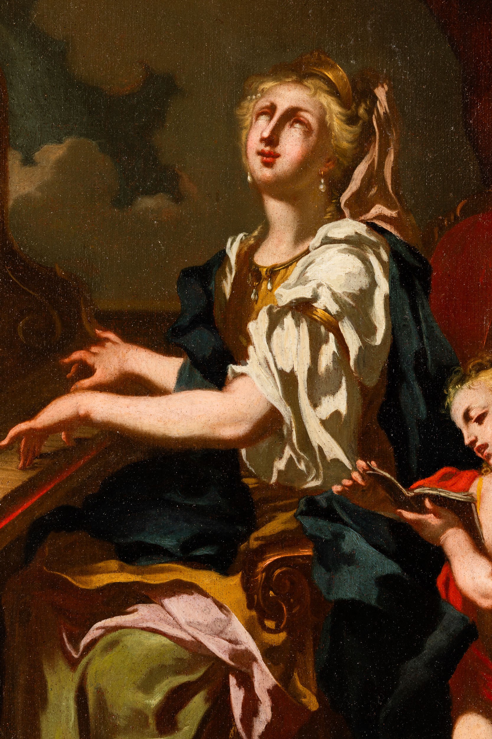 La santa, avvolta in un ampio manto mosso da pieghe scenografiche, volge lo sguardo al cielo mentre le mani sfiorano con grazia la tastiera dell’organo. Un angelo al suo fianco, tiene tra le mani un piccolo spartito, richiamando l’identificazione tradizionale di questa santa come patrona dei musicisti. La figura di Santa Cecilia, soggetto frequente nella produzione artistica di Conca, fu veicolo ideale per rappresentare l’unione tra bellezza sensibile e ispirazione divina, in linea con il gusto spirituale del tardo Barocco e con le istanze dell’arte sacra post-tridentina.
