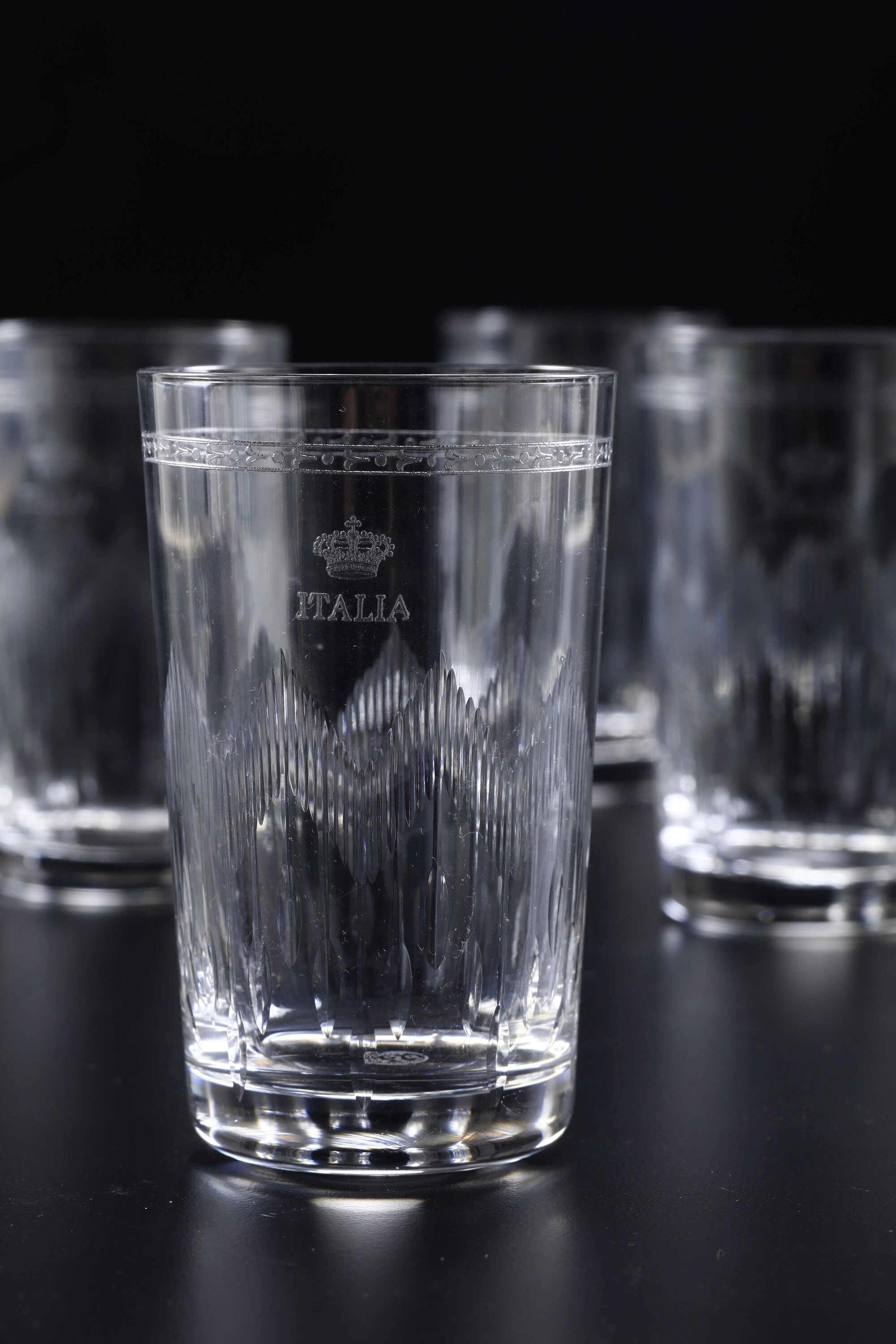 I bicchieri presentano la scritta “Italia” sormontata dalla corona reale incisi all’acido.