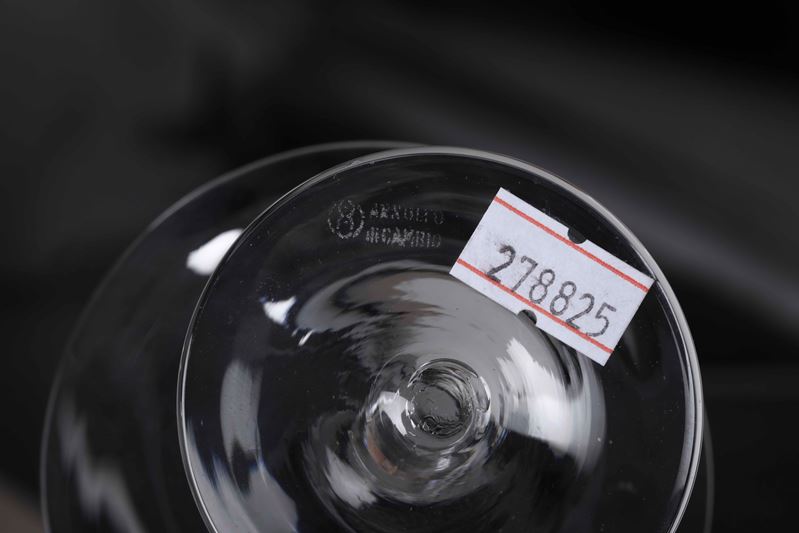 Vetro. Marca: Arnolfo di Cambio con simbolo grafico inciso all’acido. Altezza cm 7,3. Conservazione: un calice con sbeccatura al bordo superiore.