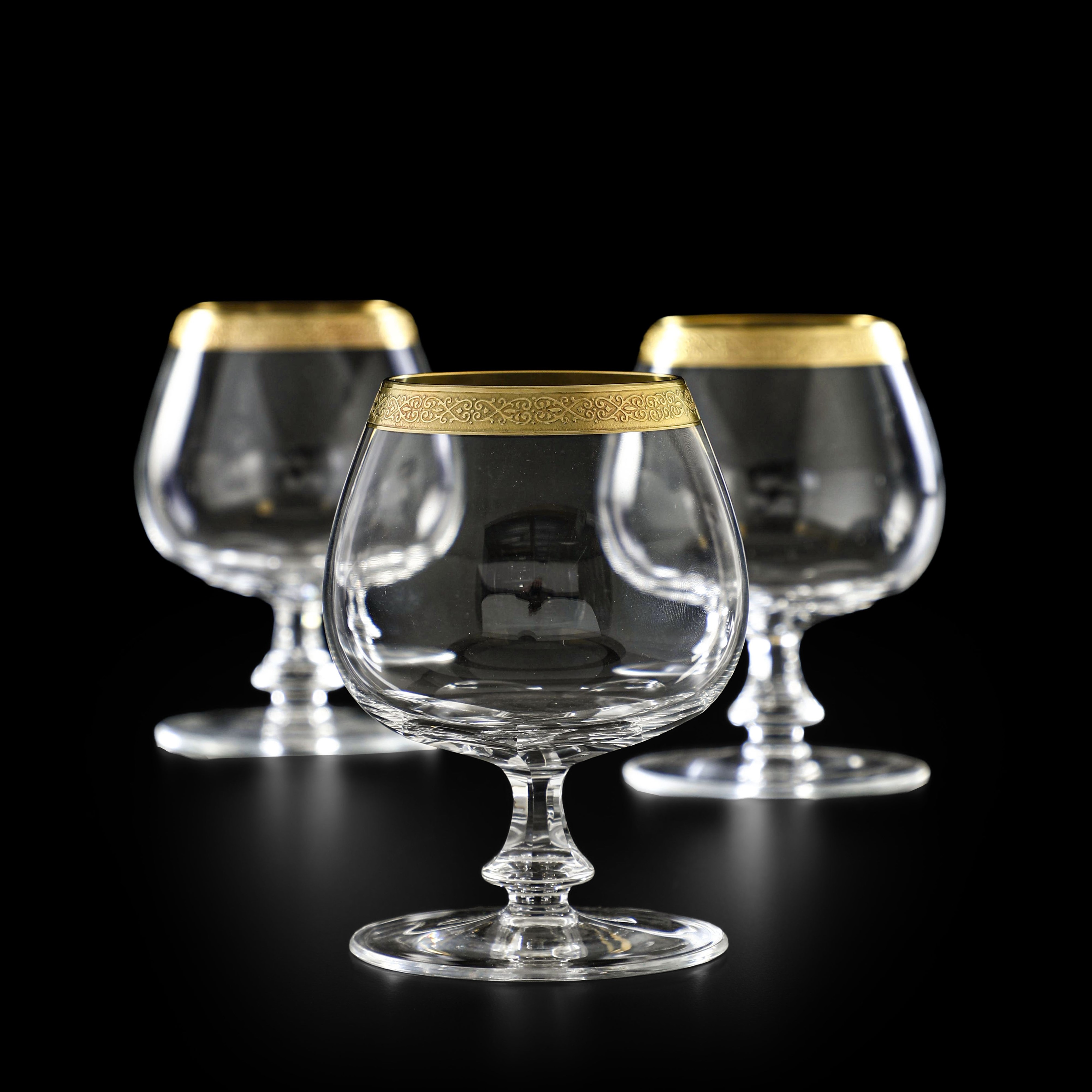 I calici dal piede tondo, stelo a balaustro e coppa trasparenti portano al bordo superiore una fascia dorata a motivi vegetali in rilievo.