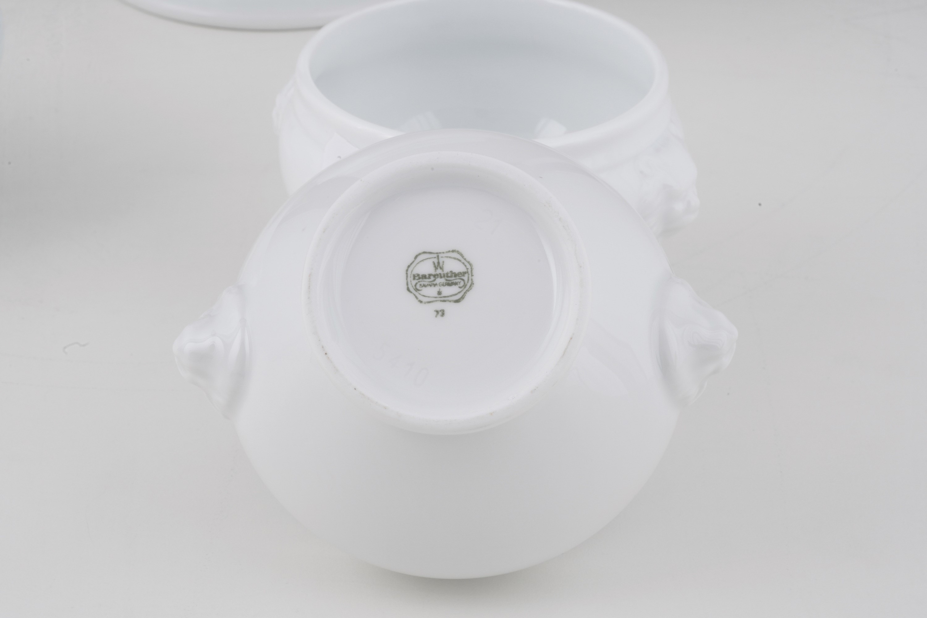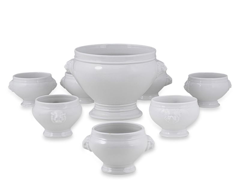 Porcellana. Marca: "Bareuther"; "Ginori" o assente. Dimensioni: zuppiera altezza cm 18; ciotole altezza cm 8,5 circa. Conservazione: ottima; una ciotola con sbeccatura alla base