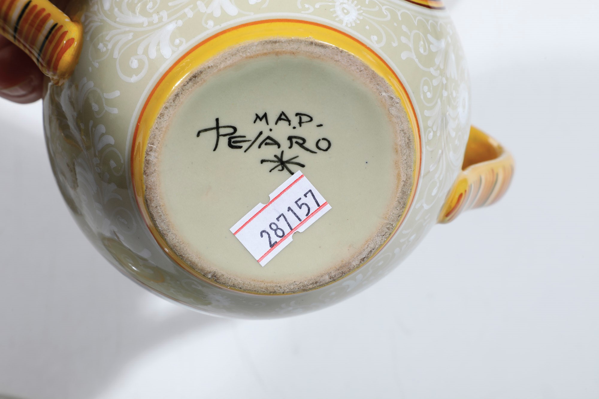 Maiolica. Marca:"M.A.P. Pesaro" con asterisco in manganese. Conservazione: ottima; due tazze e un piattino con piccole sbeccature al bordo.