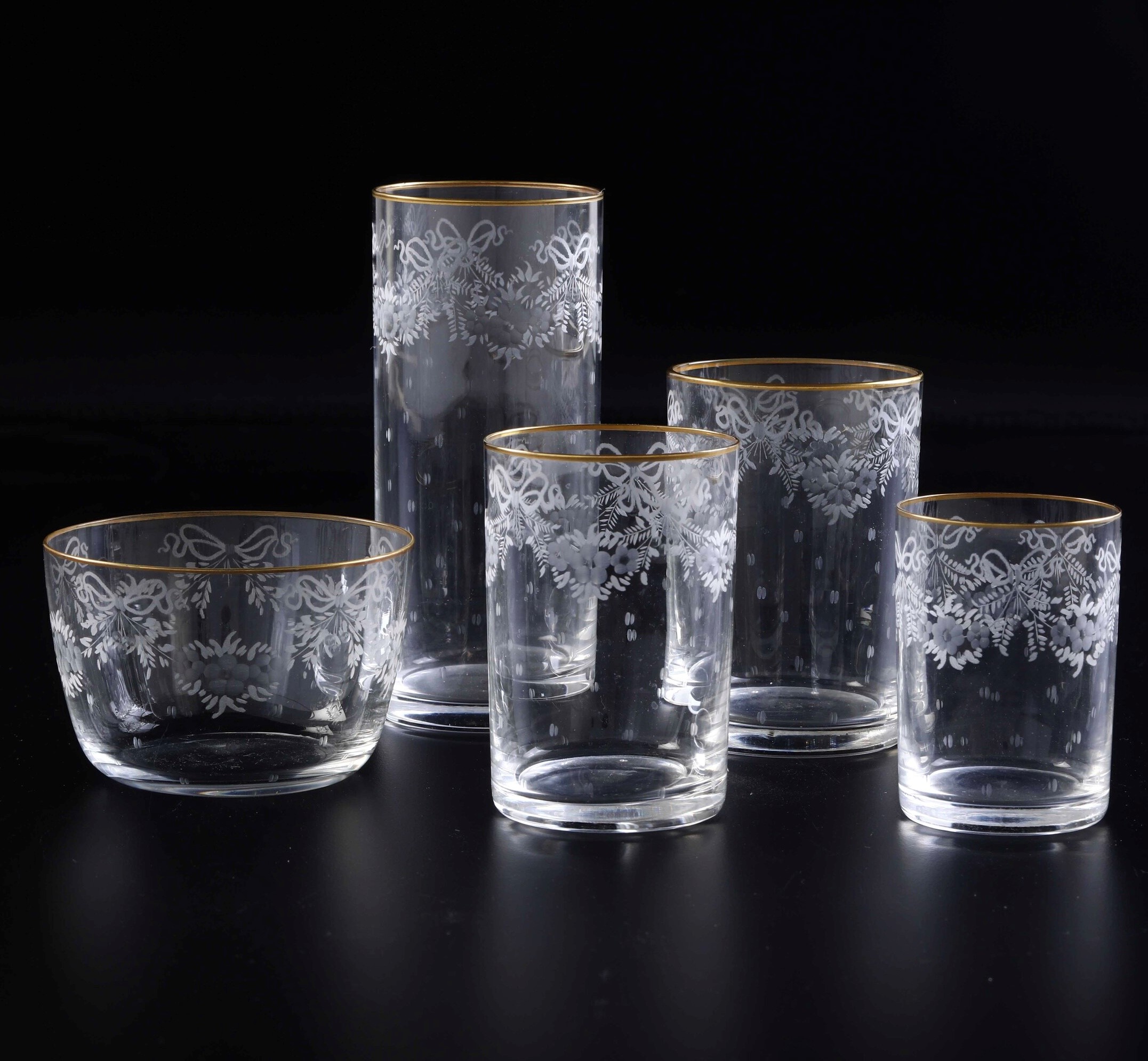 Cristallo inciso alla mola con bordo dorato. Marca: assente. Conservazione: ottima.