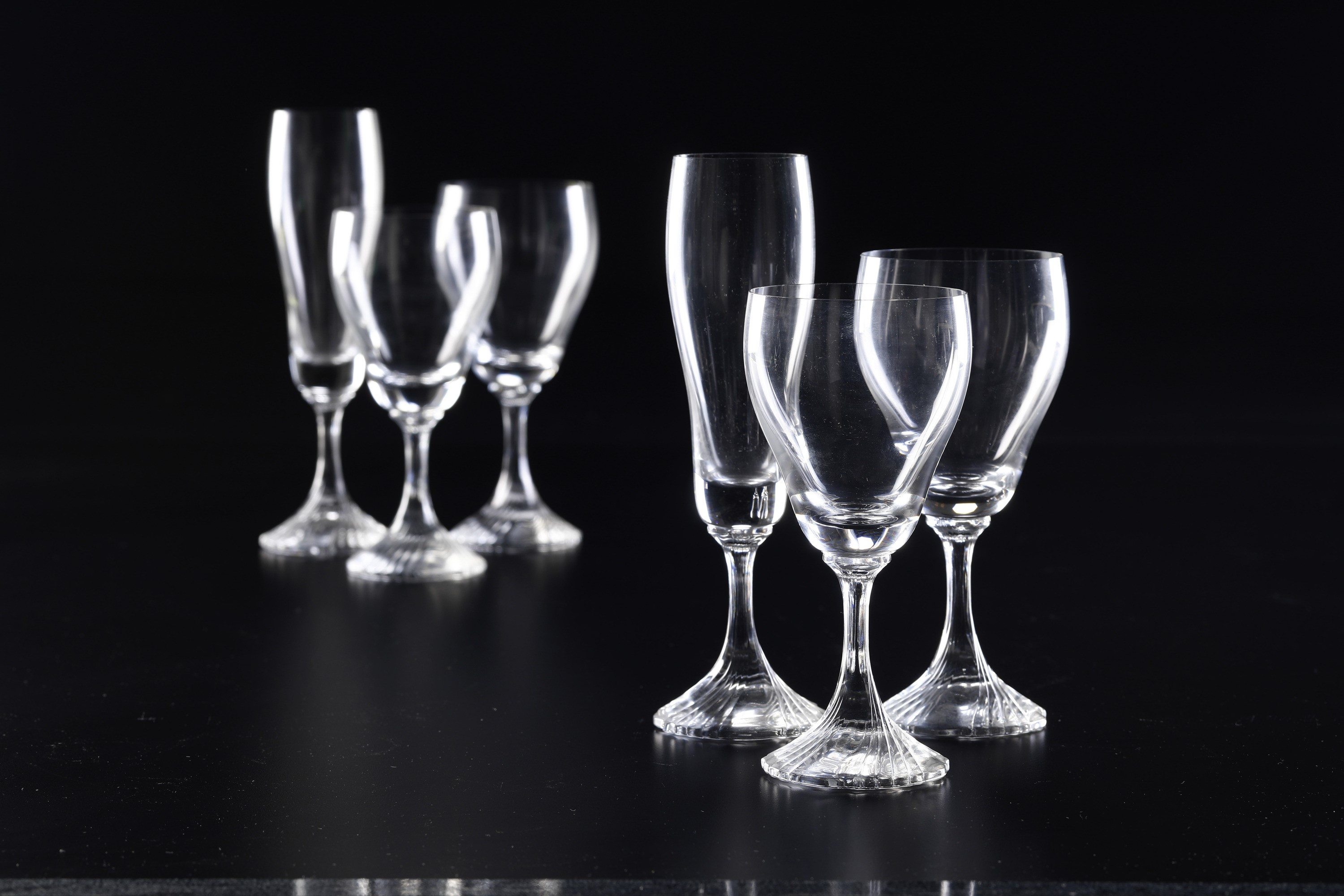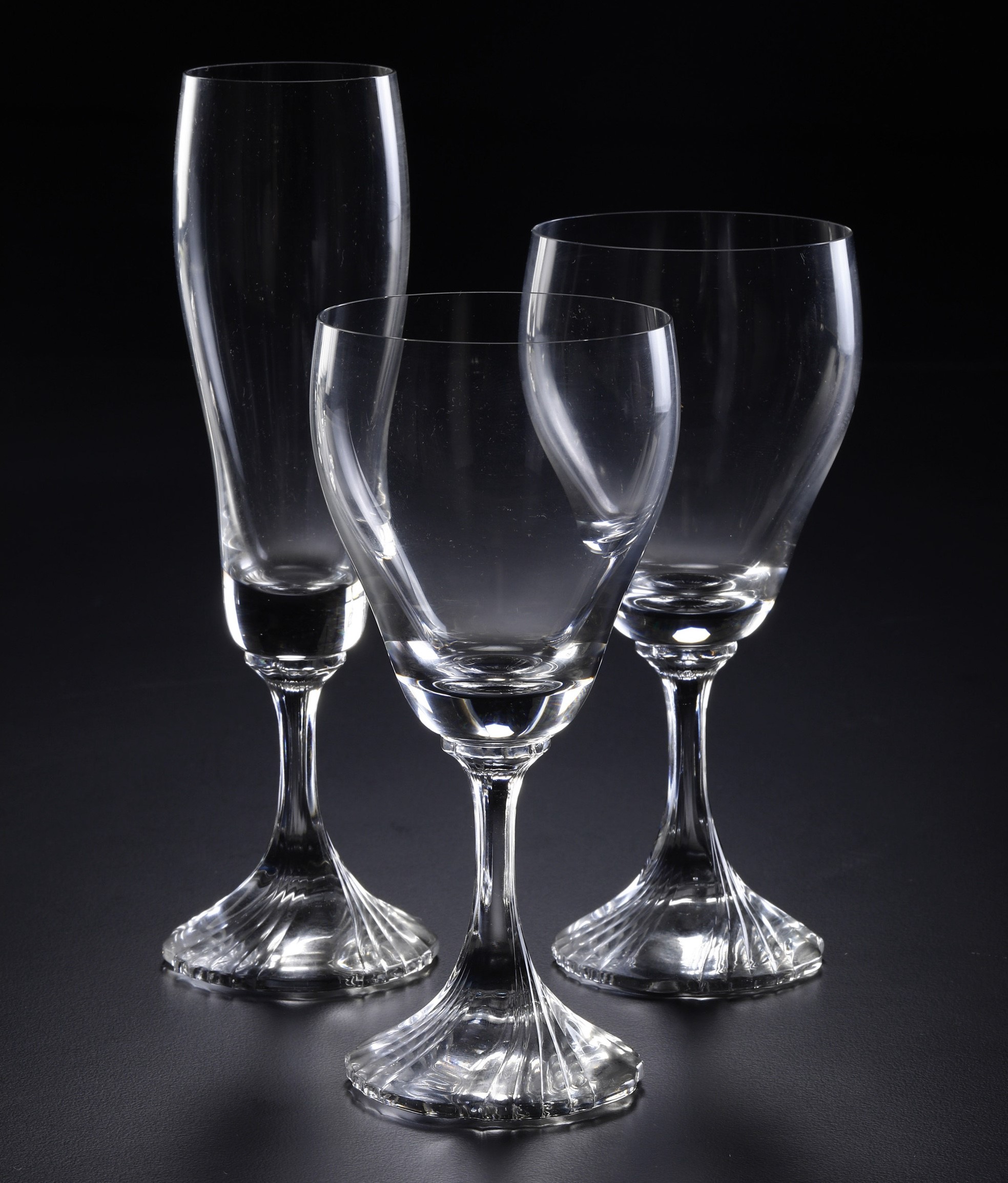Il servizio conta 33 pezzi ed è così composto: 12 calici da acqua (altezza cm 16,5); 12 calici da vino (altezza cm 16); 9 flûtes (altezza cm 20; 1 pezzo con lieve sbeccatura al bordo superiore)..